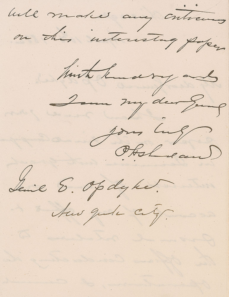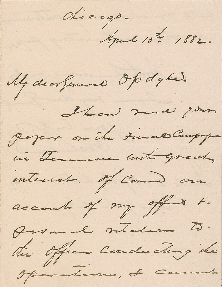 ALS signed “P. H. Sheridan,” one page both sides, 5 x 6.5, April 10, 1882. Letter to General Opdycke. In full: “I have read your paper on the Final Campaign in Tennessee with great interest. Of course on account of my official & personal relations to the offices conducting the operations, I cannot well make any criticisms on this interesting paper.” In fine condition, with the central horizontal mailing fold passing through the tops of a few letters in the signature. Pre-certified PSA/DNA.