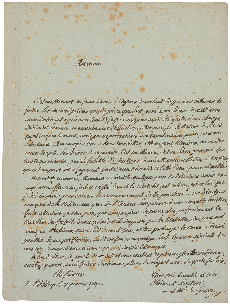 ALS in French, signed “Le M’is de Favras,” one page, 7 x 9.25, January 7, 1790. In full (translated): “It is at the moment when I had the consoling hope of being able to shed light in the charges which (according to what happened at my session of accusation right after my arrest) I can suppose to have been made against me that I was subjected to a growing number of afflictions. Not by the nature of the secret, which is always the same, but by the most extraordinary precautions taken for my maintenance. Much as I try to work it out I cannot understand the cause of this procedure at all; It is an illusion, a dream for me that everything that is happening to me by the fatality of the conclusions, doubtless seemingly probable in your eyes, which, by deceiving your judgment cause my downfall as well as that of my charming wife.
