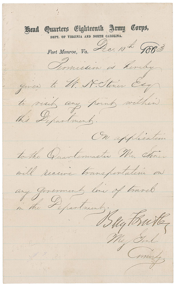 Two items: war-dated LS signed “Benj. F. Butler,” one page, 5 x 8, Head Quarters Eighteenth Army Corps letterhead, December 10, 1863, in part: “Permission is hereby given…to visit any point within this Department”; and an ink free frank signature, “Benj. F. Butler, MC,” on an off-white 4.75 x 1.75 slip clipped form a mailing envelope. In overall fine condition. Pre-certified PSA/DNA.