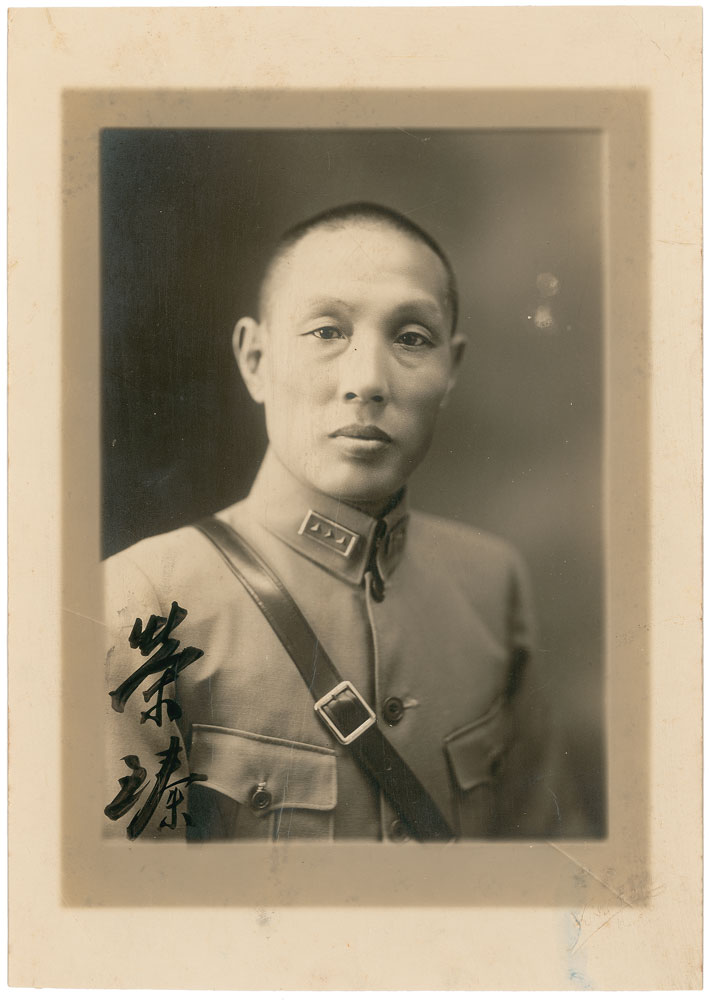 Militant of Northern China (1891-?). Vintage matte-finish 7 x 10 photo, boldly signed in black ink in Chinese. This exceptional image, taken by Yung Fang photographers of Peking, exhibits their official blind-stamp in the bottom right corner. In very good condition, with moderate surface creases and wear, spot of discoloration to background, and slight silvering to darker areas of photo; the overall presentability of the image at arms length remains exceptional. After the collapse of the Wang Jingwei regime, Rong was arrested by Chiang Kai-Shek and sentenced to death on military tribunal: his ultimate fate remains unknown.