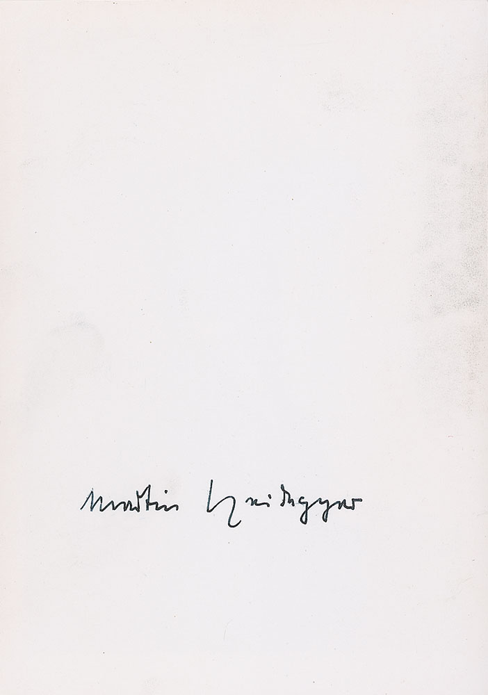 Important German philosopher (1889–1976) whose Being and Time was a fundamental text in the development of existentialism. Glossy 4 x 5.75 photo of Heidegger looking downward, boldly signed on the reverse in black ink. In fine condition. Pre-certified PSA/DNA.