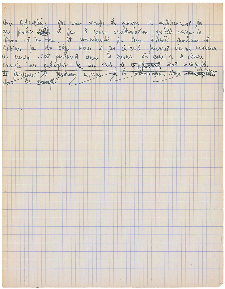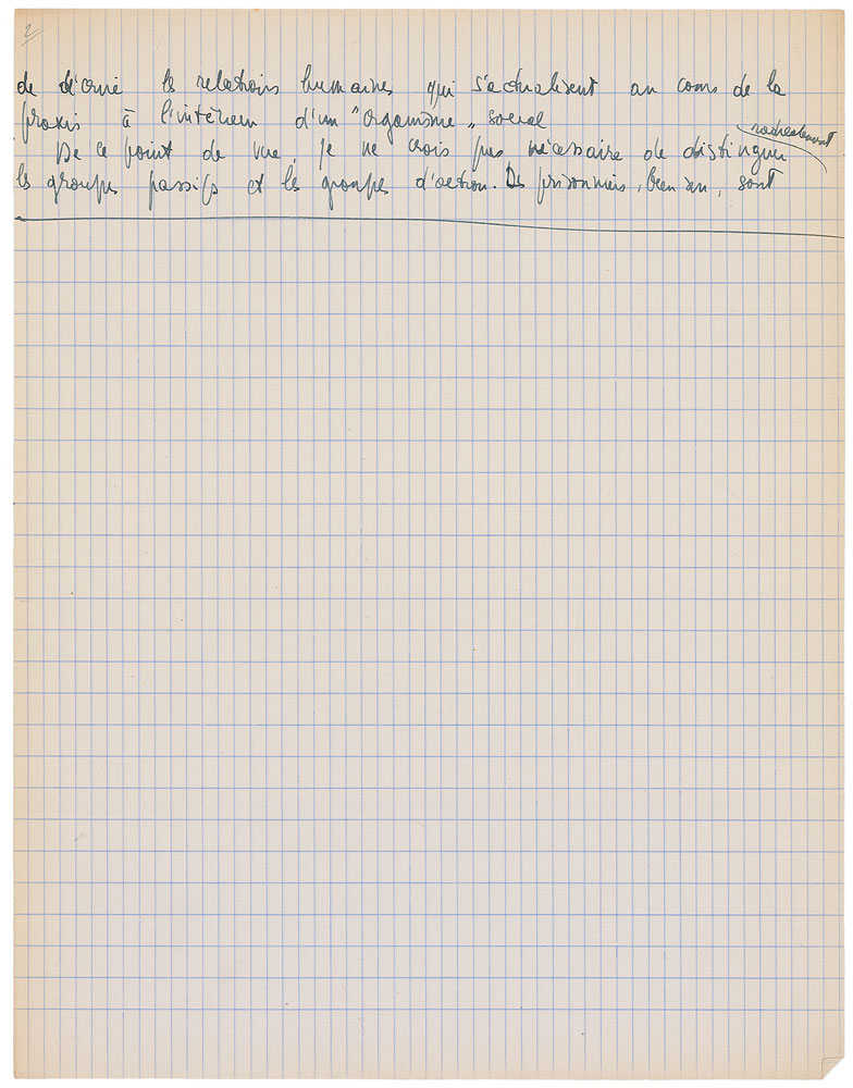 Handwritten manuscript fragment in French, unsigned, two lightly gridded pages, 8.25 x 10.5, no date. Sartre pens some thoughts on his existentialist understanding of the political dimension of human existence. In full (translated): “In the problem at hand, the groups differ in their praxis and the kind of integration it requires. Praxis, in turn, is controlled by their common interests and defined by its purpose. But if these interests may give rise to the group, it is precisely insofar as it presents itself as a company; by themselves, they are unable to describe human relationships that are updated during the praxis and within a social organization. This point of view, I do not think it necessary to radically distinguish passive groups and active groups.” Light edge toning, a couple trivial creases, and an edge tear to the lower blank area of the first page, otherwise overall fine condition. Sartre analyzes the praxis in his important Critique of Dialectical Reason. Pre-certified PSA/DNA.