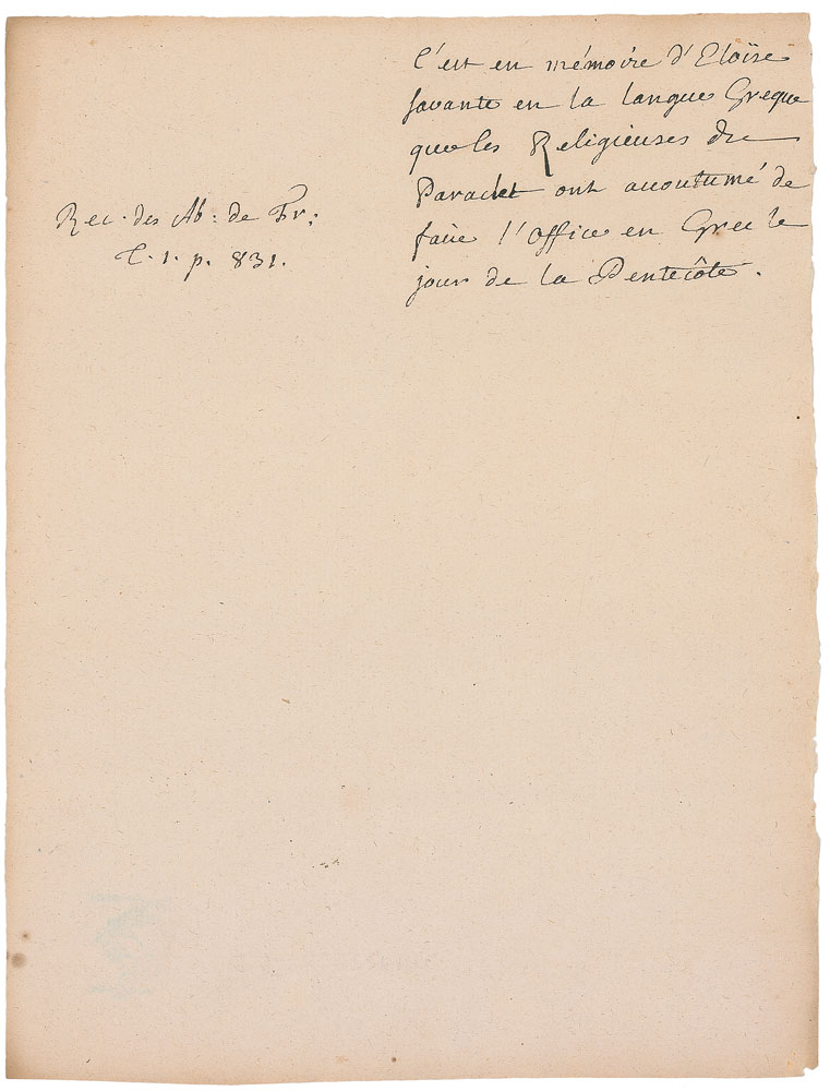 Important Swiss-French philosopher and writer who held that the individual is essentially good but usually corrupted by society (1712–1778). Rare unsigned handwritten manuscript in French, one page, 7.5 x 9.75, no date. A fragment from a manuscript related to a projected work on the history of women that Rousseau undertook at the insistence of his patron Mme. Dupin. In full (translated): “This is in memory of Heloise, learned in Greek that the nuns of the Paraclete are accustomed to the Greek office on the day of Pentecost.” The reference of this quote is written in the margin. In fine condition. One of Rousseau’s chief works was entitled Julie, or the New Heloise, which drew its name from the history of Heloise d’Argenteuil and Peter Abelard, a medieval story of passion and Christian renunciation. An exceedingly rare and intriguing piece. Pre-certified John Reznikoff/PSA/DNA.
