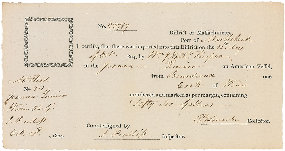 Major general in the Continental Army (1733-1810) during the American Revolutionary War, known as the officer who formally accepted the British surrender at Yorktown. Choice partly-printed DS, signed “B. Lincoln,” one page, 9.5 x 5, October 20, 1804. Lincoln signs off on an import “from Bordeaux one Cask of Wine numbered and marked as per margin, containing Fifty Six Gallons.” In fine condition. Pre-certified PSA/DNA.