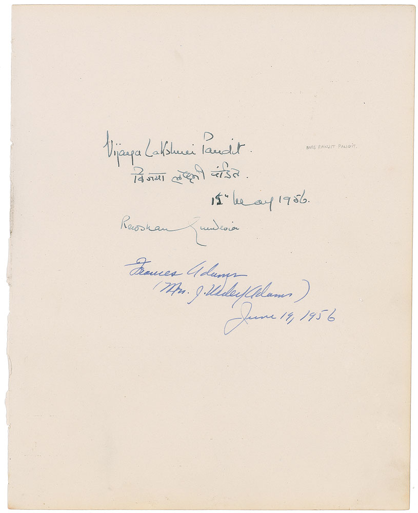 Indian diplomat and politician (1900–1990), related to Prime Ministers Jawaharlal Nehru, Indira Gandhi, and Rajiv Gandhi. Ink signatures in English and Hindi, “Vijaya Lakshmi Pandit,” on an off-white 8 x 10 sheet removed from a book, signed and dated May 12, 1956. Signed below by two others. In fine condition. Pre-certified PSA/DNA.