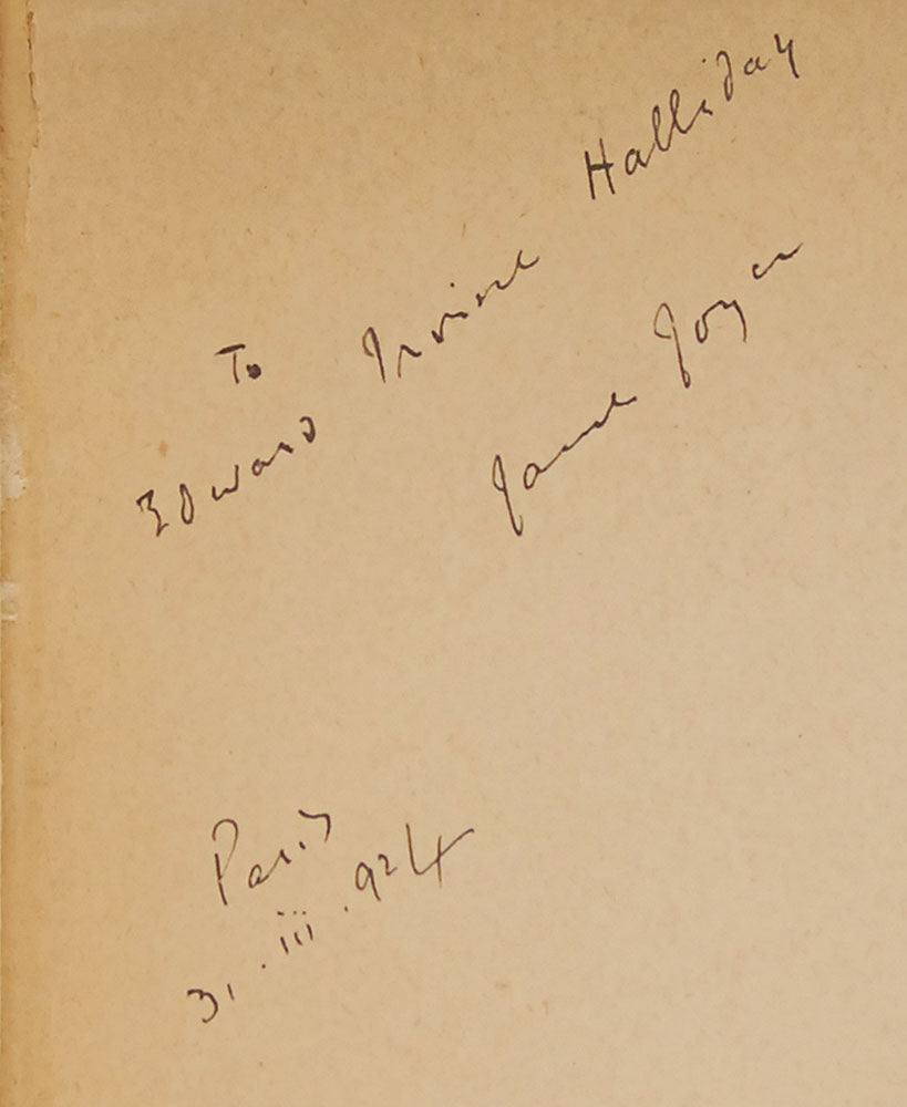 Signed book: Ulysses. First edition, fourth printing. Paris: Shakespeare and Company, 1924. Hardcover, 6.75 x 8, 736 pages. Neatly signed and inscribed on the first free end page in crisp black ink, “To Edward Irvine Halliday, James Joyce, Paris, 31. iii. 924.” Autographic condition: uniform fragile toning, a few small edge chips, and an inch-long tear to the upper left edge near the spine (in no way affecting the inscription or signature), otherwise fine. Book condition: VG-/None. Edward Irvine Halliday (1902–1984) was a painter and student at the Royal College of Art, attending classes on a travel scholarship at the Academie Colarossi in Paris when Joyce inscribed this copy of Ulysses for him. He was highly regarded for his portraits, portraying many members of the British royal family and foreign dignitaries. As an extremely rare early edition of this iconic work inscribed to a portrait artist as a young man, this is an immensely desirable cornerstone piece.