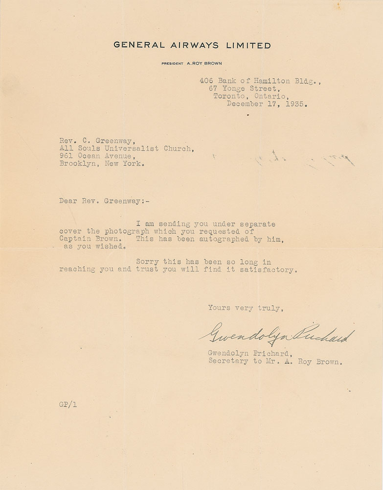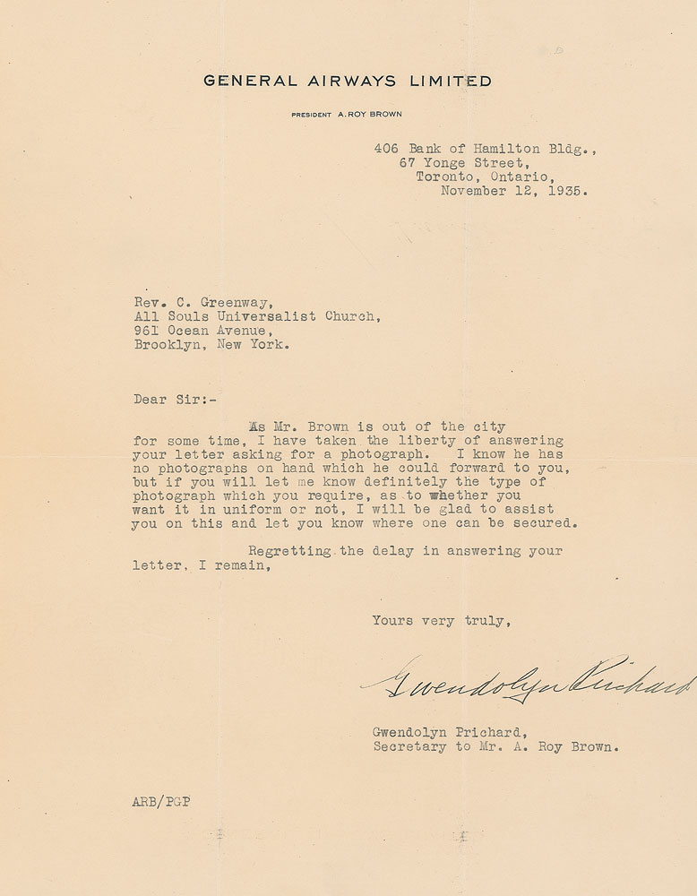 Canadian aviator and World War I ace (1893–1944) officially credited with bringing down the Red Baron, though later investigations indicated that the kill was most likely made by an Australian anti-aircraft machine gunner. Scarce matte-finish 7 x 9.25 formal portrait of Brown in uniform, affixed to its original 10 x 14 photographer’s mount, signed in fountain pen, “A. Roy Brown.” Housed in its original presentation folder. In very good condition, with blocks of toning and creases to the mount, subtle horizontal marks near the bottom of the image due to ink transfer from a newspaper clipping laid on top, silvering to dark areas of the image, and light contrast to signature against the dark background. Accompanied by two letters of transmittal from his office, dated 1935. Pre-certified PSA/DNA.