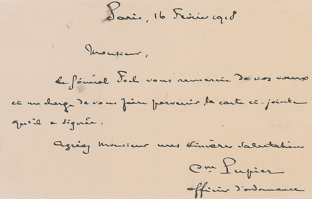 French military officer (1851–1929) who served as Supreme Commander of the Allied Armies in the final months of World War I. Handsome World War I-era 3.5 x 5.25 postcard photo by Henri Manuel of General Foch in uniform, signed in black ink, “F. Foch.” In fine condition. Accompanied by a letter of transmittal from his Chief of Cabinet, Claude Pupier, dated February 16, 1918. Pre-certified PSA/DNA.