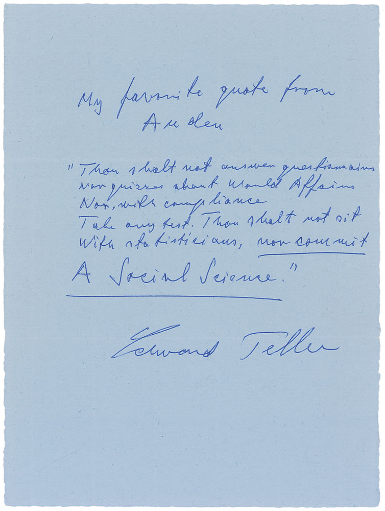 Attractive AQS on a light blue 6 x 7.75 sheet, signed at the conclusion. Teller pens a portion of the poem, Under Which Lyre: A Reactionary Tract for the Times, in full: “My favorite quote from Auden, ‘Thou shalt not answer questionnaires nor quizzes about world affairs nor, with compliance, take any test. Thou shalt not sit with statisticians nor commit A Social Science.’” In fine condition. From the collection of noted publisher and founder of Lord John Press, Herb Yellin. Pre-certified PSA/DNA.