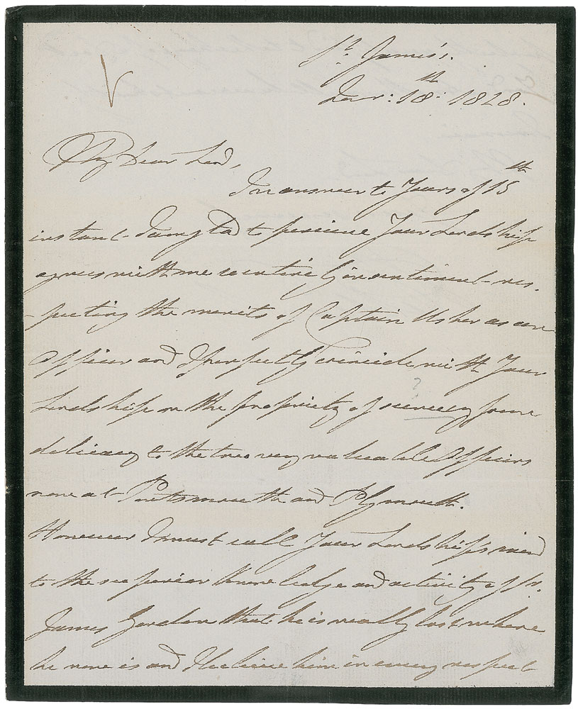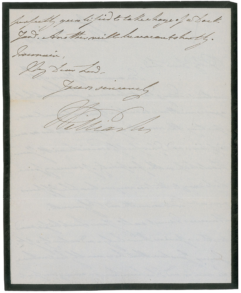 King of Great Britain and Ireland (1765–1837) from 1830 to 1837, he earned the sobriquet ‘Sailor King’ for his youthful service in the Royal Navy. ALS signed “William,” one page, 7.25 x 9, January 18, 1828. In part: “I am glad to perceive Your Lordship agrees with me so entirely in sentiment—respecting the merits of Captain Usher as an Officer…However I must call Your Lordship’s view to the superior knowledge and activity of Sr. James Gordon that he is really lost where he now is and I believe him in every respect perfectly qualified to take charge of a Dock Yard.” In fine condition, with intersecting folds (one vertical fold passing through a single letter of the signature). Pre-certified PSA/DNA.