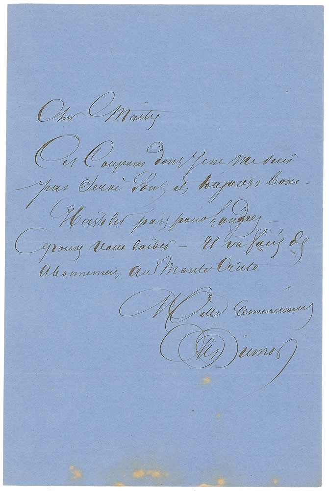ALS in French, signed “A. Dumas,” one page, 5.25 x 8, no date but likely circa mid to late 1840s. In full (translated): “Are these coupons which I have not used still valid? Herstoler is leaving for London? can you be of assistance to him? He is going to secure some subscriptions to Monte Cristo.” In fine condition, with scattered discolored spots at the bottom. Dumas’s famous adventure novel The Count of Monte Cristo was first serialized in the Journal des Debats. A great letter regarding the publication of the novel which quickly became the most popular book in Europe. Pre-certified PSA/DNA.