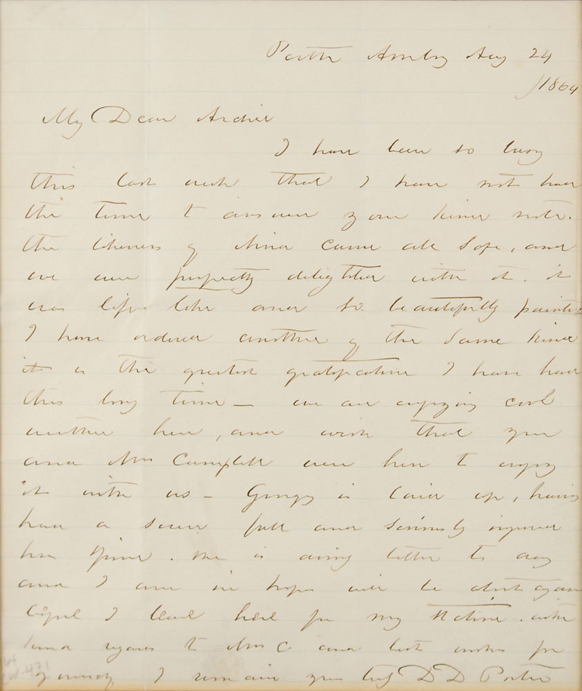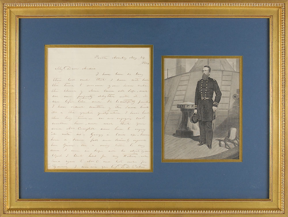 Civil War–dated ALS signed “D. D. Porter,” one page, lightly-lined, 7.25 x 8.5, August 24, 1864. Letter to a close friend, regarding a photograph. In part: “The likeness of him came all safe, and we are perfectly delighted with it. I have ordered another of the same.” Nicely double-matted and framed with an engraved portrait to an overall size of 20.5 x 15.5. In fine condition, with intersecting folds and light edge toning. Pre-certified PSA/DNA.