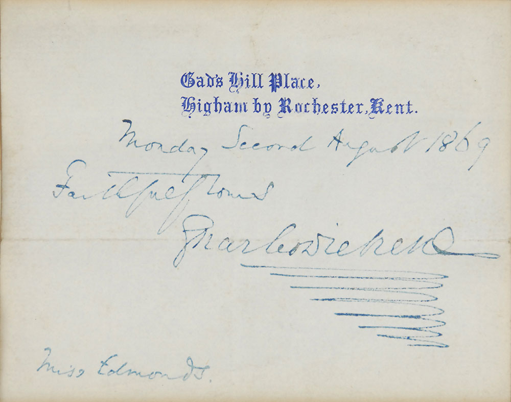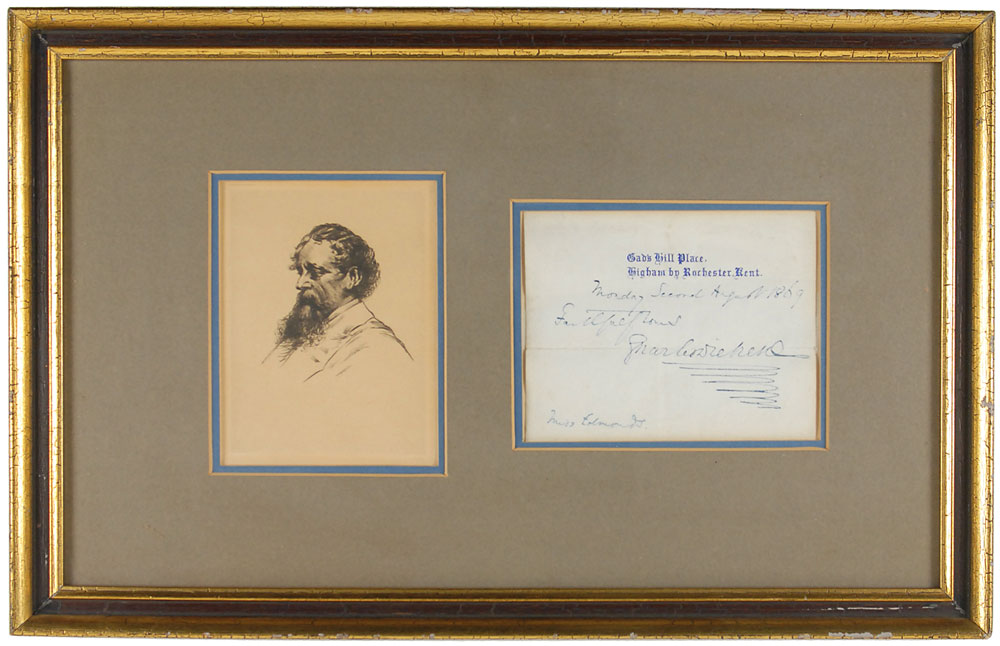 Ink signature, “Monday, Second August 1869, Faithfully yours, Charles Dickens,” adding the recipient, “Miss Edmonds,” in the lower left, on an off-white 4.5 x 3.5 sheet of his Gad’s Hill Place letterhead. Nicely double-matted and framed with an etching of the author to an overall size of 14.5 x 9.25. In very good condition, with a horizontal fold passing through the signature, scattered creases, and light soiling. Pre-certified PSA/DNA.