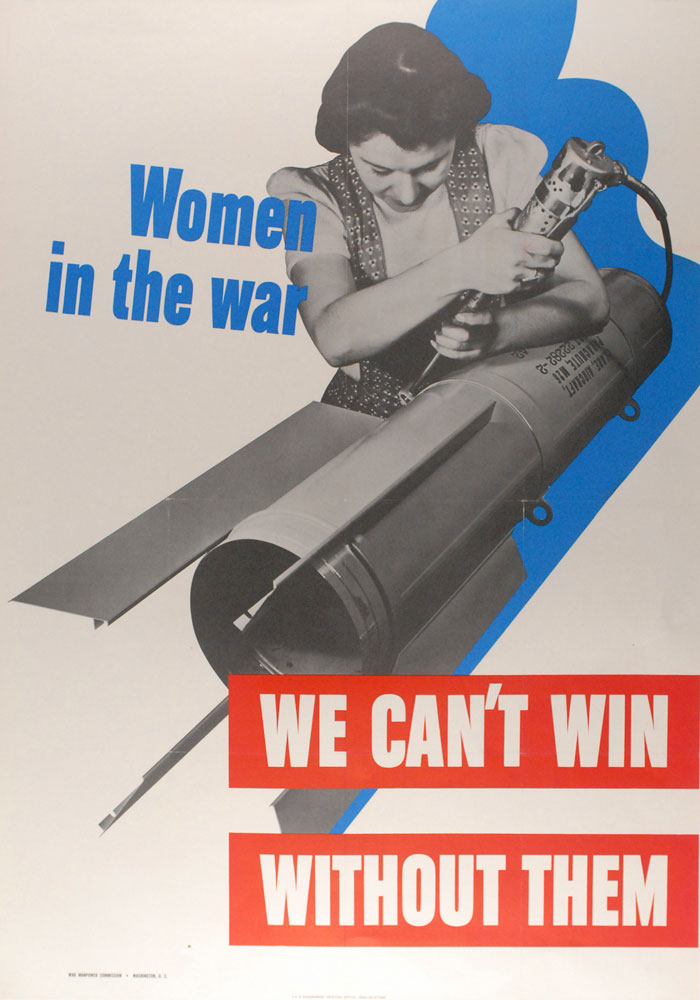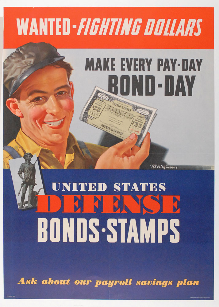 Collection of three original color World War II posters, all from 1942, and ranging in size from 20 x 28 to 28 x 40. Titles are: ‘We Can’t Win Without Them,’ picturing a woman working to assemble an AN-M26 parachute flare; ‘Say Yes! Take your change in War Stamps,’ featuring faces of three military men; and ‘Wanted—Fighting Dollars,’ showing an American citizen holding a war bond. Accompanied by four identical 7.5 x 11 World War I newspaper art supplement posters with vivid patriotic Howard Chandler Christy artwork. World War II posters are professionally linen-backed and in overall fine condition.