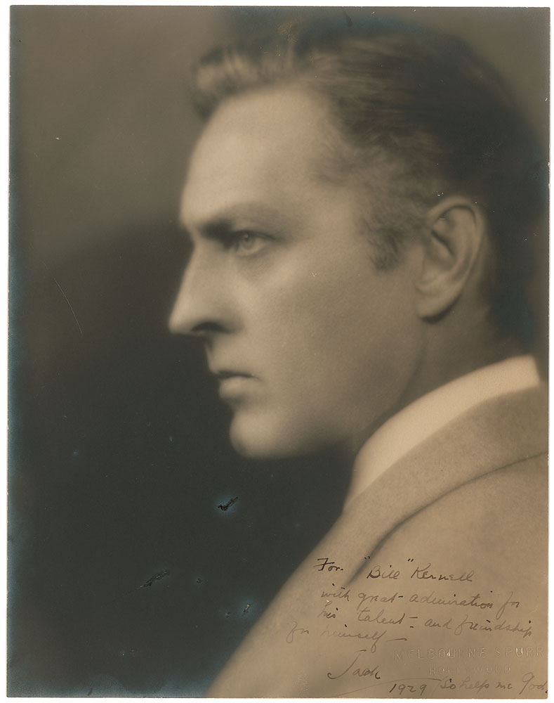 Handsome vintage pearl-finish 7.25 x 9.5 portrait of Barrymore in a pensive profile pose, signed and inscribed in fountain pen, “For, ‘Bill’ Kernell, with great admiration for his talent—and friendship, for himself—Jack, 1929, So help me God.” Blindstamped in the lower left by the photographer, Melbourne Spurr. In otherwise fine condition, with slight silvering to uniformly trimmed edges, tape and adhesive remnants to reverse, and a few small surface marks and nicks retouched. According to biographer Gene Fowler, of all of the photos taken of Barrymore, the actor’s favorite was this wistfully contemplative portrait from 1929. Pre-certified PSA/DNA.