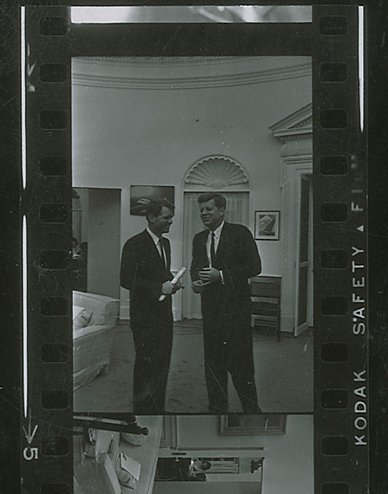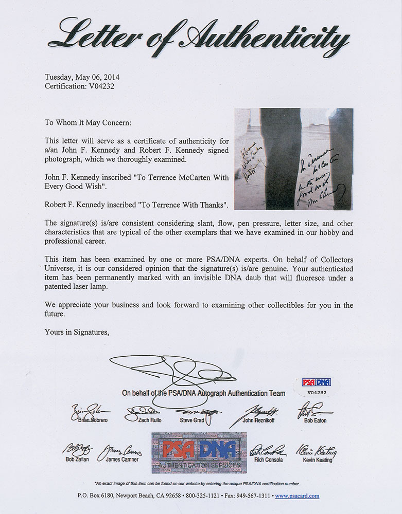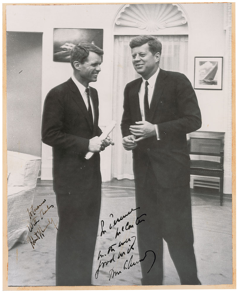 Supremely rare glossy 7.5 x 9.5 photo of John F. Kennedy and his brother Robert in the Oval Office, both men relaxed and smiling, signed and inscribed in fountain pen, “To Terence McCarten, with every good wish, John F. Kennedy” and “To Terence, with thanks, Robert F. Kennedy.” Affixed to a slightly larger piece of mat board, with photo edges slightly trimmed, and a bit of irregular ink adhesion to RFK’s last name, otherwise fine condition. Almost all of the writing is contained in light portions of the photo away from the Kennedys’ dark suits, resulting in remarkable clarity; JFK’s signature is exceptionally bold. Additionally included is an original contact sheet picturing eleven images of JFK and RFK from McCarten’s session (including the dual-signed image being offered here, located at the top right). Accompanied by full letters of authenticity from PSA/DNA and JSA. Terence McCarten was an award-winning news photographer who worked at the New York Herald Tribune and New York Post during his career, and became friendly with the Kennedy brothers while covering the 1960 presidential campaign. Showing both leaders at the height of their political clout, with JFK as president and RFK as attorney general, this image captures a remarkable candid moment between brothers. Photographs signed by both Jack and Bobby Kennedy are virtually nonexistent; this is the sole example we’ve encountered in 35 years. An extraordinary image of these American icons and an absolute rarity of great historical significance.