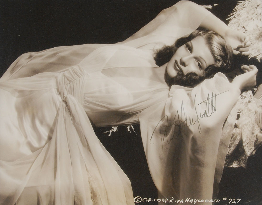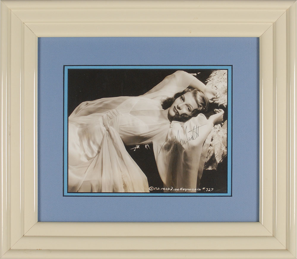 Fantastic vintage glossy 8.75 x 6.75 photo of a sultry Hayworth lounging in a white dress, boldly signed in fountain pen. Double-matted and framed to an overall size of 16.25 x 14.25. In fine condition. A seductive, uninscribed and uncommon pose of the celluloid enchantress. The James Collings Collection; ex. Irwin Oster. Pre-certified PSA/DNA.