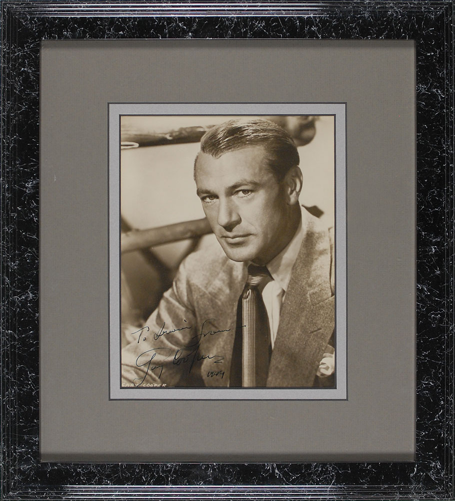 Refined vintage glossy 7 x 8.75 portrait of Cooper with his hair neatly slicked back, signed and inscribed in fountain pen, “To Irwin, from—Gary Cooper, 1944.” Double-matted and framed to an overall size of 15 x 16.5. In fine condition. An exceptionally handsome image of Cooper, who, at the time of the signature, helped form International Pictures, a production company which he ultimately sold to Universal Studios two years later. The James Collings Collection; ex. Irwin Oster. Pre-certified PSA/DNA.