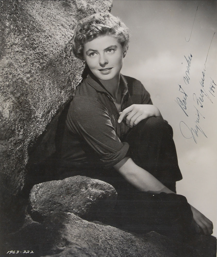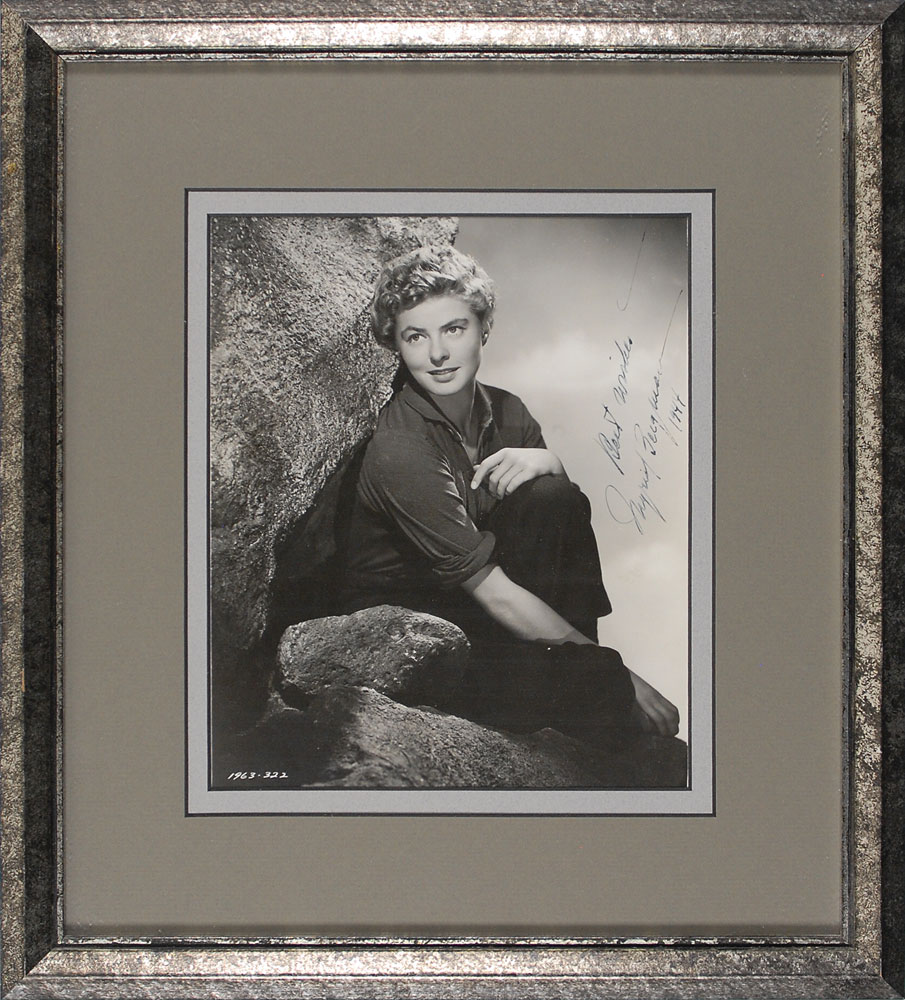 Beautiful vintage glossy 7.5 x 9 photo of a short-haired Bergman from the 1943 film For Whom the Bell Tolls, signed in fountain pen, “Best wishes, Ingrid Bergman, 1944.” Nicely double-matted and framed to an overall size of 14 x 15.5. In fine condition. A year after receiving an Oscar nomination for her portrayal of Maria in the film adaptation of Hemingway’s For Whom the Bell Tolls, Bergman won her first Academy Award for her role as Paula Alquist in George Kukor’s 1944 thriller, Gaslight. The James Collings Collection; ex. Irwin Oster. Pre-certified PSA/DNA.