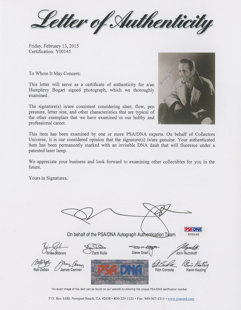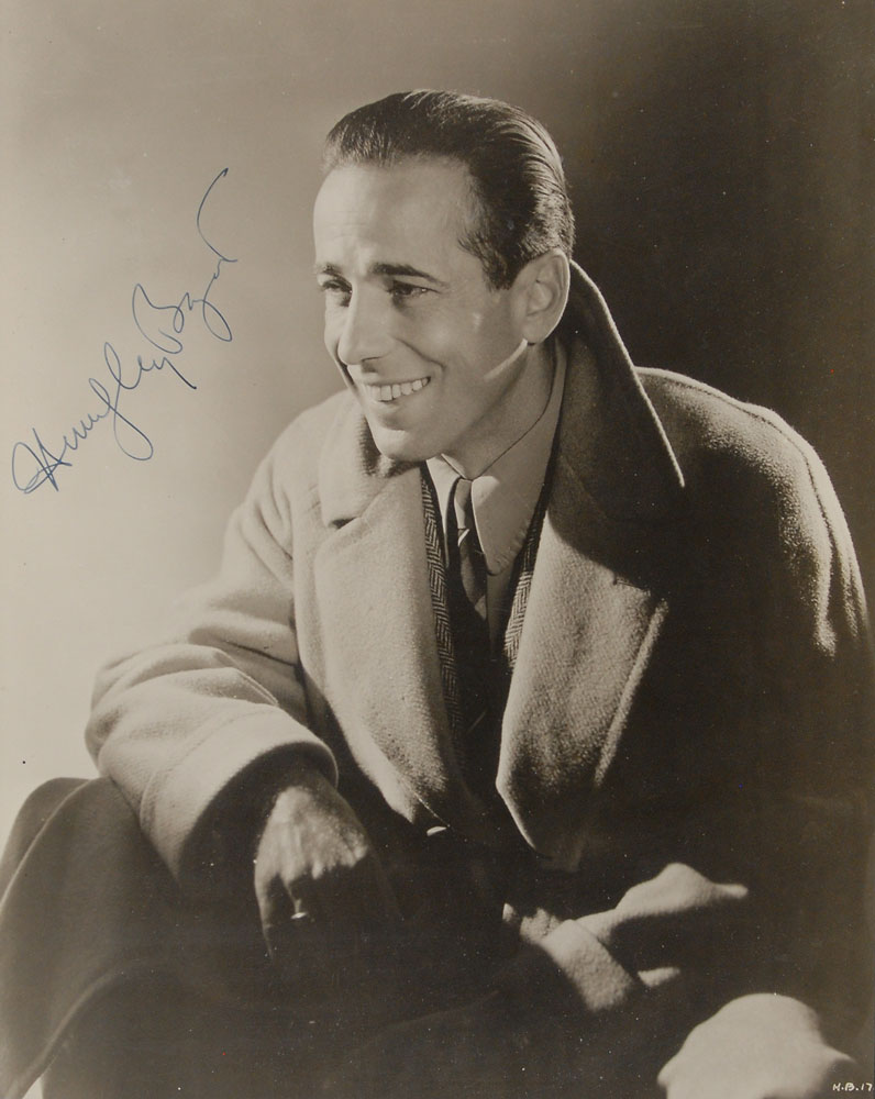 Handsome vintage glossy 7.25 x 9.25 seated photo of Bogart in a woolen coat, boldly signed in fountain pen. Triple-matted and framed to an overall size of 15 x 16.75. In fine condition. A superb, uncharacteristically cheerful image of the typically brooding Hollywood legend. Accompanied by a full letter of authenticity from PSA/DNA. The James Collings Collection; ex. Irwin Oster.