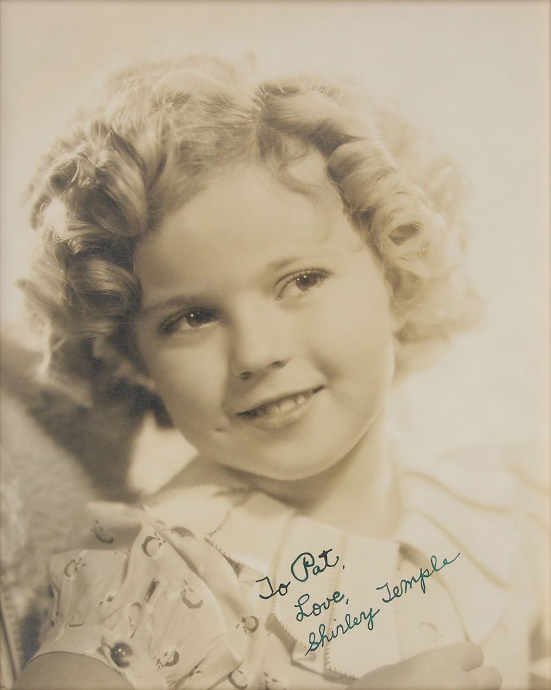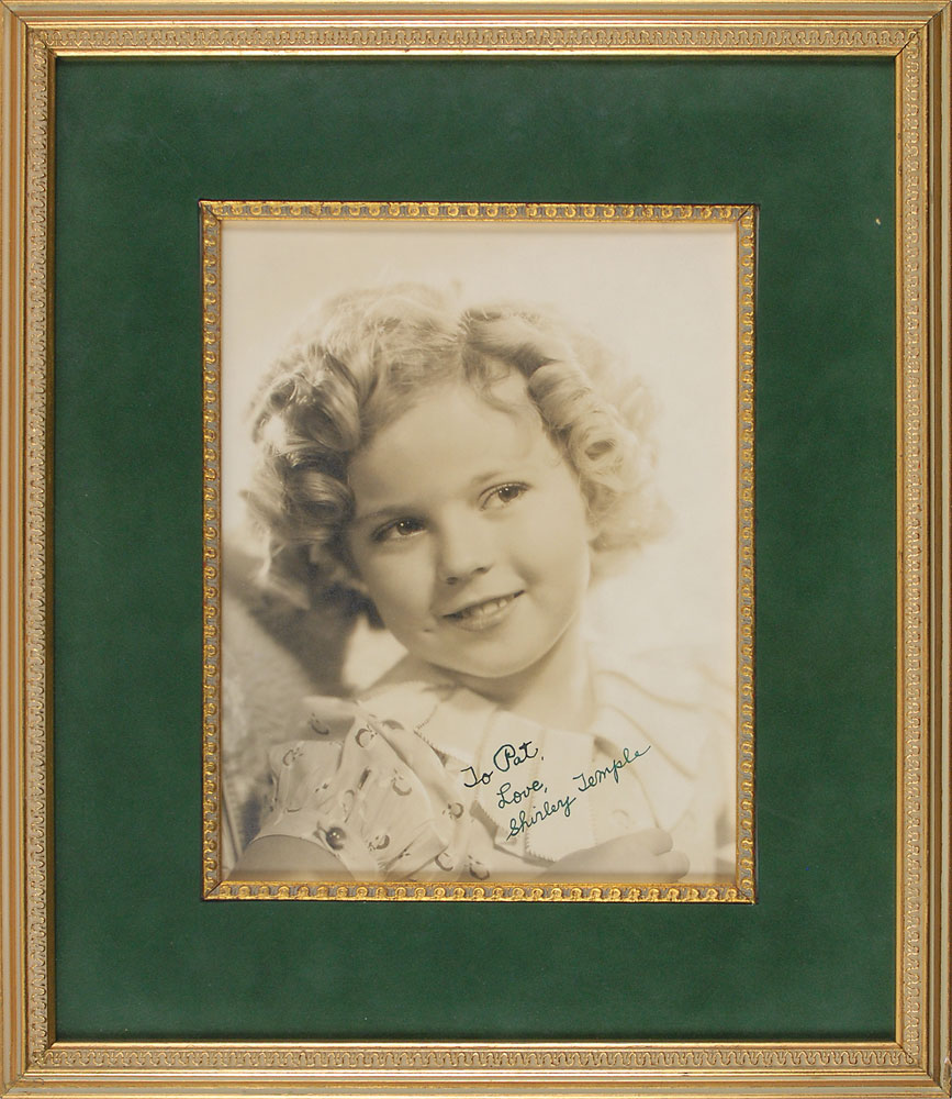 Adorable vintage matte-finish 7 x 9 portrait of a young Temple with her trademark ringlets, boldly signed and inscribed in green fountain pen, “To Pat, Love, Shirley Temple.” Intricately suede-matted and framed to an overall size of 13 x 15. In fine condition. A pristine image of the beloved child star. The James Collings Collection.  Pre-certified PSA/DNA.