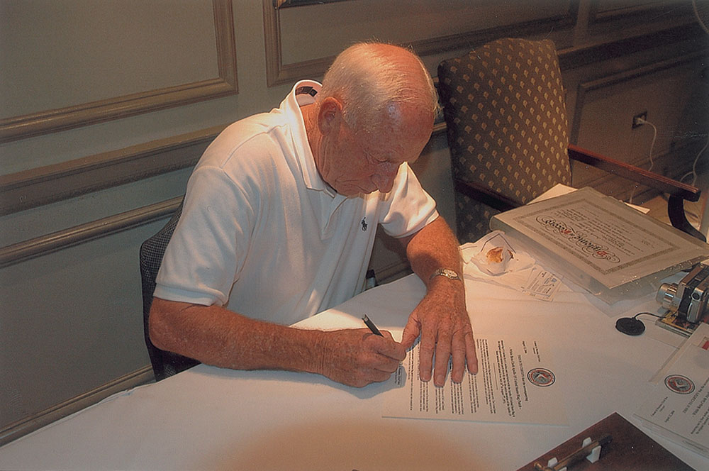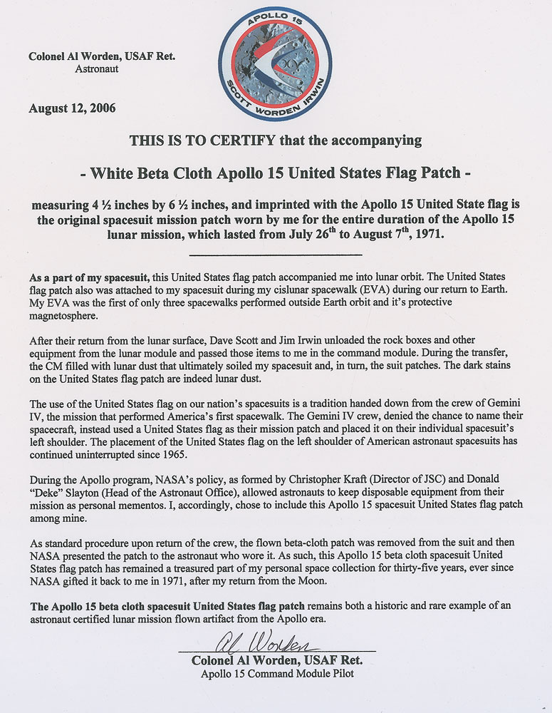 Incredible flown American flag Beta cloth patch, 6.5 x 4.5, worn on the left shoulder of Worden’s spacesuit during the entirety of the Apollo 15 mission. Due to its constant use and exposure to the vacuum of deep space during Worden’s 38-minute extra-vehicular activity, the patch exhibits heavy overall creases and wrinkling, and a few small tears to the flag design. Accompanied by a detailed letter of provenance signed by Worden, in part: “As a part of my spacesuit, this United States flag patch accompanied me into lunar orbit. The United States flag patch also was attached to my spacesuit during my cislunar spacewalk (EVA) during our return to Earth. My EVA was the first of only three spacewalks performed outside Earth orbit and it’s protective magnetosphere. After their return from the lunar surface, Dave Scott and Jim Irwin unloaded the rock boxes and other equipment from the lunar module and passed those items to me in the command module. During the transfer, the CM filled with lunar dust that ultimately soiled my spacesuit and, in turn, the suit patches. The dark stains on the United States flag patch are indeed lunar dust.” Also includes three photos of Worden taken at the time of signing and a color glossy 11 x 8.5 photo of Worden’s spacewalk, signed in silver ink, “The first deep space walk during the flight of Apollo 15. Al Worden, Apollo 15 CMP.” A unique and absolutely fantastic item directly from an astronaut’s suit representing the height of America’s space program.