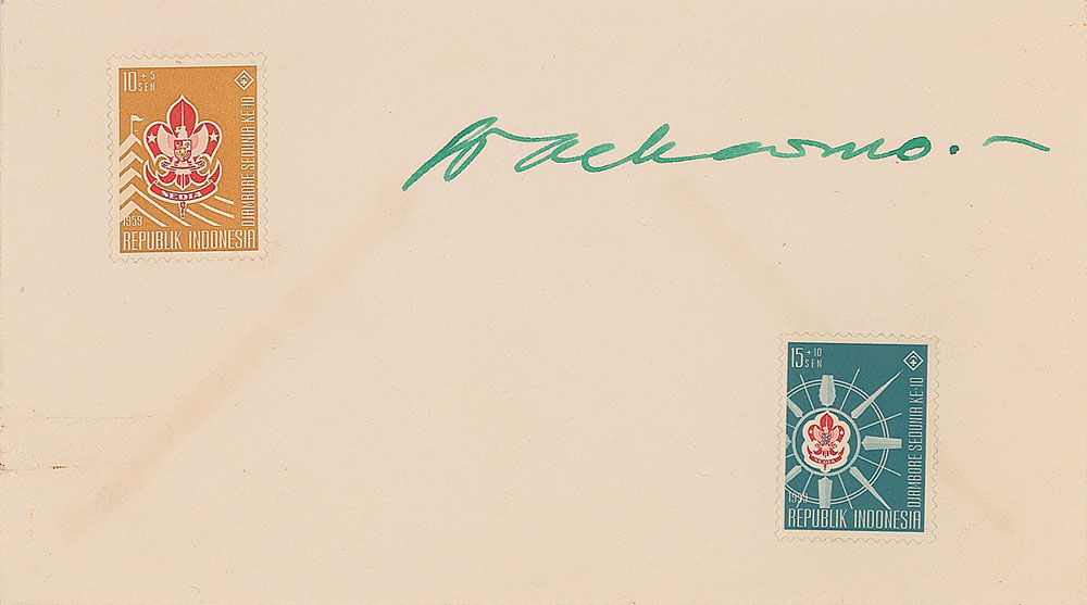 First president of Indonesia (1901–1970) who spearheaded his country’s struggle for independence from the Netherlands. Green ink signature on an off-white 6.5 x 3.5 envelope bearing a pair of Republic of Indonesia stamps. In fine condition, with two light strips of toning and a paperclip impression to left edge. Pre-certified PSA/DNA.