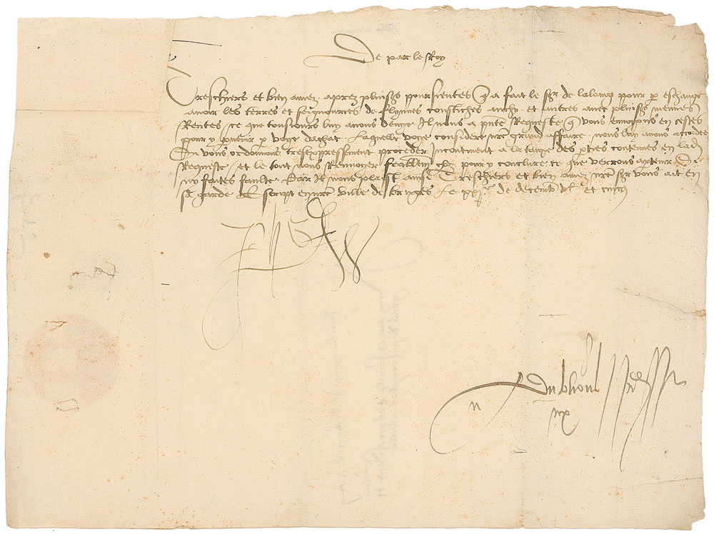 The son of Holy Roman Emperor Maximilian I and grandson of Charles the Bold, known as Philip the Handsome (1478–1506); he was the first member of the house of Habsburg to be King of Castile. He reigned with his wife Joanna the Mad, before passing away suddenly of typhoid fever at the age of 28. Manuscript DS, signed “Philip,” one page, 11.5 x 8.5, December 21, 1505. Addressed to his treasurer in Lille, France, ordering him to sell his lands and manors of Flines les Raches, Coutiches, and Auchy-les-Orchies to the lord of Lalang, who until then had wished to make an exchange. In part (translated): “He presented us a new request...whereas an agreement of sale could be reached, which we considered an acceptable deal, which we granted him.” In very good condition, with intersecting folds (vertical folds passing through two letters of the signature), light foxing, a few tears repaired with tape to reverse, and a professionally restored area of paper loss to the upper left corner. An exceedingly rare royal document. Pre-certified PSA/DNA.