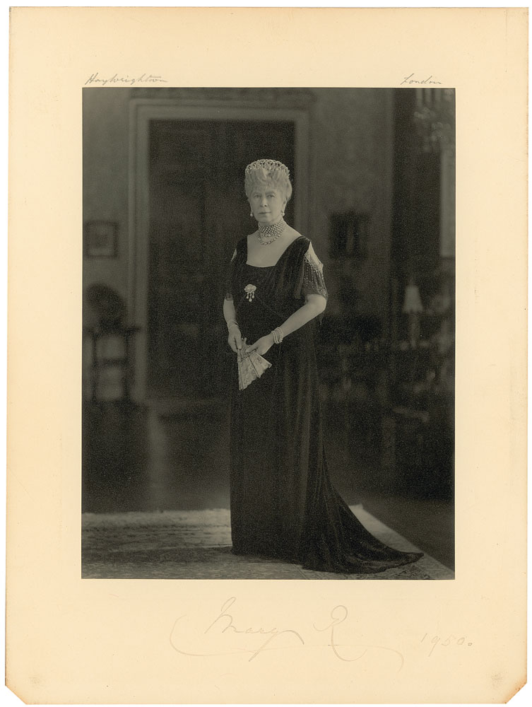 Wife of King George V (1867–1953). Satin-finish 6.25 x 8.25 full-length portrait of the queen, affixed to its original 8.75 x 11.75 mount, signed on the mount in fountain pen, “Mary R, 1950.” Also signed at the top in pencil by the photographer, Henry Wrightson. One small surface impression to background of image, and the signature light but legible, otherwise fine condition. Pre-certified PSA/DNA.