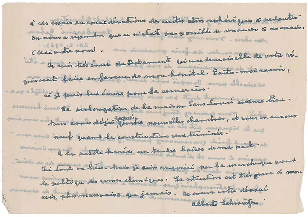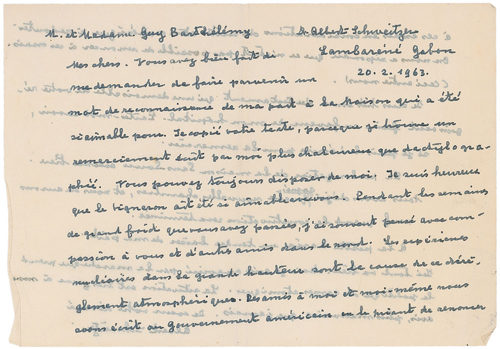 ALS in French, signed once at the top of the first page and again at the conclusion, one onionskin page both sides, 8.25 x 5.75, February 20, 1963. Letter to Mr. and Mrs. Guy Barthelemy, in part (translated): “I copied your text, because I find a thank-you letter written by me more emotional than a typed one. You can always avail yourself of me. During the weeks of very cold weather you have had, I often thought with compassion of you and other friends in the north. The nuclear experiments at high altitudes are the cause of this atmospheric disorder. Friends of mine and I myself have written to the American government to ask them to forgo these tests in considering the atmospheric consequences to be feared. They replied that it was not possible to forgo these tests. (This between us.) I am very moved by the bequeathal that a young lady of your region has made in favor of my hospital. Let me know if I can write to thank her. The expansion of the San-Souci Building is progressing well. We have already added four new rooms and will have nine construction is completed. Here everything is fine. But I am anguished by the turn politics is taking in atomic weapons. The situation is very grave, in my opinion, worse than ever.” In fine condition, with a central vertical fold, moderate scattered creasing (heavier to edges), and show-through from writing on opposite sides. Pre-certified PSA/DNA.