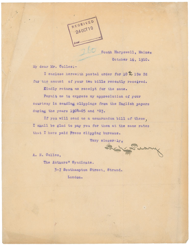 ALS signed “R. E. Peary,” one page, 8.5 x 11, October 16, 1910. Letter to A. N. Colles, in full: “I enclose herewith postal order for 10£ 19s 2d for the amount of your two bills recently received. Kindly return me receipt for the same. Permit me to express my appreciation of your courtesy in sending clippings from the English papers during the years 1904–05 and ’07. If you will send me a memorandum bill of these, I shall be glad to pay you for them at the same rates that I have paid Press clipping bureaus.” In very good condition, with intersecting folds (one vertical fold passing through a single letter of the signature), scattered creasing, spreading to the signature, and a stamp, office notation, and staple holes to the top. Pre-certified PSA/DNA.