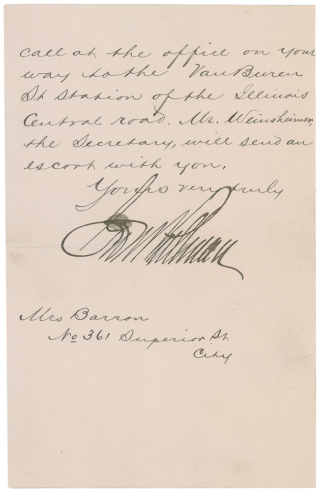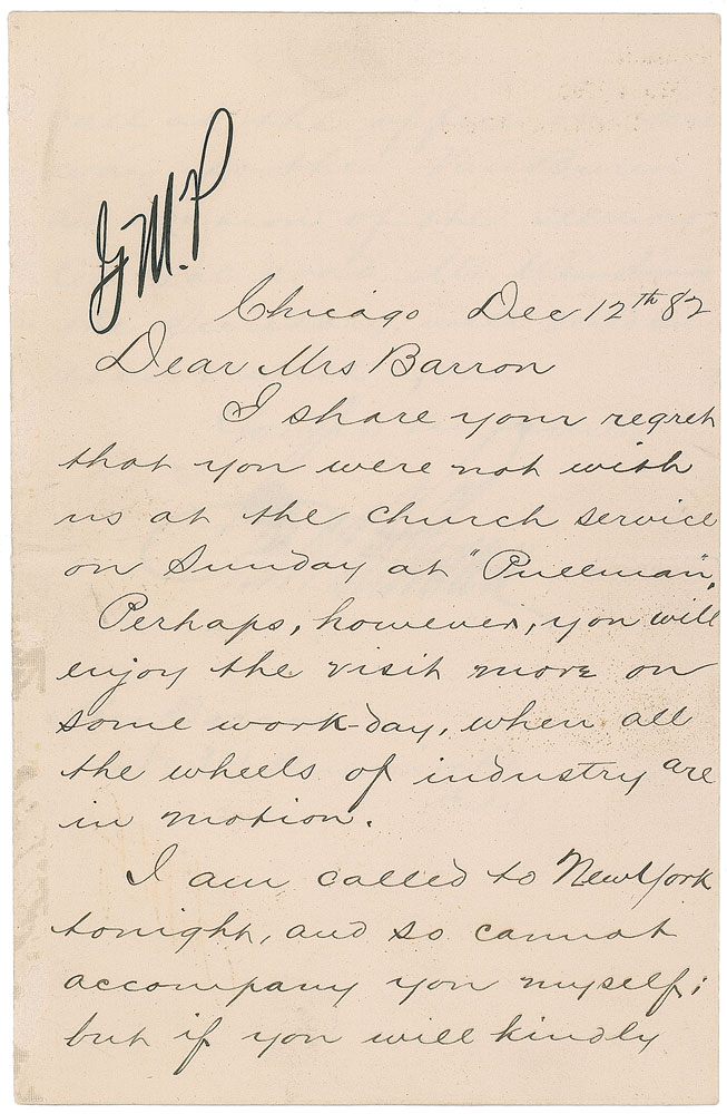 American inventor and industrialist (1831–1897) best known for developing the first successful railroad sleeping car. ALS signed “Geo M. Pullman,” two pages on two adjoining sheets, 4.25 x 6.75, personal letterhead, December 12, 1882. Letter to Mrs. Barrow, in full: “I share with your regret that you were not with us at the church service on Sunday at ‘Pullman.’ Perhaps, however, you will enjoy the visit more on some work-day, when all the wheels of industry are in motion. I am called to New York tonight, and so cannot accompany you myself; but if you will kindly call at the office on your way to the Van Buren St. station of the Illinois Central road, Mr. Weinsheimer, the Secretary, will send an escort with you.” A horizontal fold (passing through the signature), mild paper loss and adhesive remnants to front left edge, and some spreading to ink in a few letters of the signature, otherwise fine condition. Pre-certified PSA/DNA.