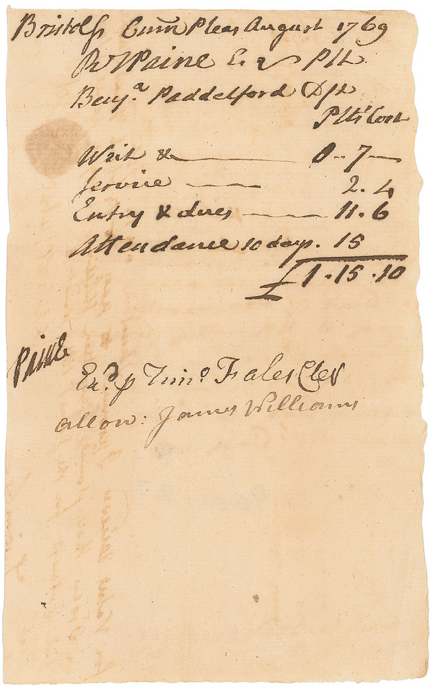 Massachusetts lawyer (1731–1814) who served as one of the prosecutors of British soldiers during the Boston Massacre trial; he later signed the Declaration of Independence. Endorsement signature, “Paine,” at the conclusion of a manuscript legal document, one page, 3.75 x 6.25, dated August 1769. The document is a bill for the costs to a plaintiff involved in a legal case, amounting to £1.15.10. A central vertical fold, light toning, and mirroring to ink from a page no longer present, otherwise fine condition. Pre-certified PSA/DNA.