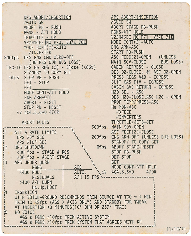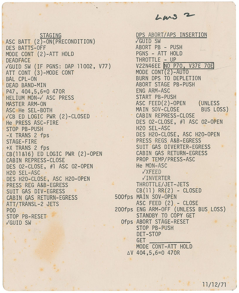 Unflown Apollo 16 double-sided cue card labeled “LMS 2” at the top in black felt tip, 6.25 x 7.75, with headings including “Staging,” “DPS Abort/APS Insertion,” “DPS Abort/Insertion,” and “APS Abort/Insertion.” In very good condition, with moderate foxing and soiling.