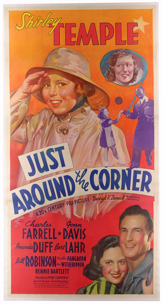 Just Around the Corner (20th Century Fox, 1938). Three sheet movie poster (42.5 x 81). Musical comedy starring Shirley Temple, Bill Robinson, Bert Lahr, and Charles Farrell. Linen-backed and professionally restored to fine condition, with the lower sheet slightly misaligned. The James Collings Collection; ex. Jo Ann Janzen.