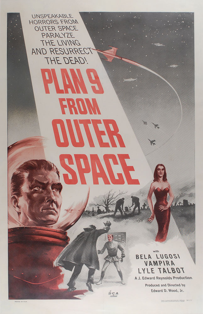 Plan 9 from Outer Space (DCA, 1958). One sheet movie poster (27 x 41). Classic science-fiction thriller starring Gregory Walcott, Mona McKinnon, Tor Johnson, Vampira, and Bela Lugosi in what has been famously called the ‘worst movie ever made,’ telling the story of extraterrestrial beings who are seeking to stop humanity from creating a doomsday weapon that would destroy the universe. Matted and framed to an overall size of 28.5 x 43.5. Professionally restored to fine condition. Written, produced, directed, and edited by Ed Wood, the enduring classic posthumously features Bela Lugosi, using footage he had shot for a different film prior to Lugosi’s death in 1956. Dramatically designed and eminently displayable, this is an exceptionally desirable science-fiction piece. The James Collings Collection.