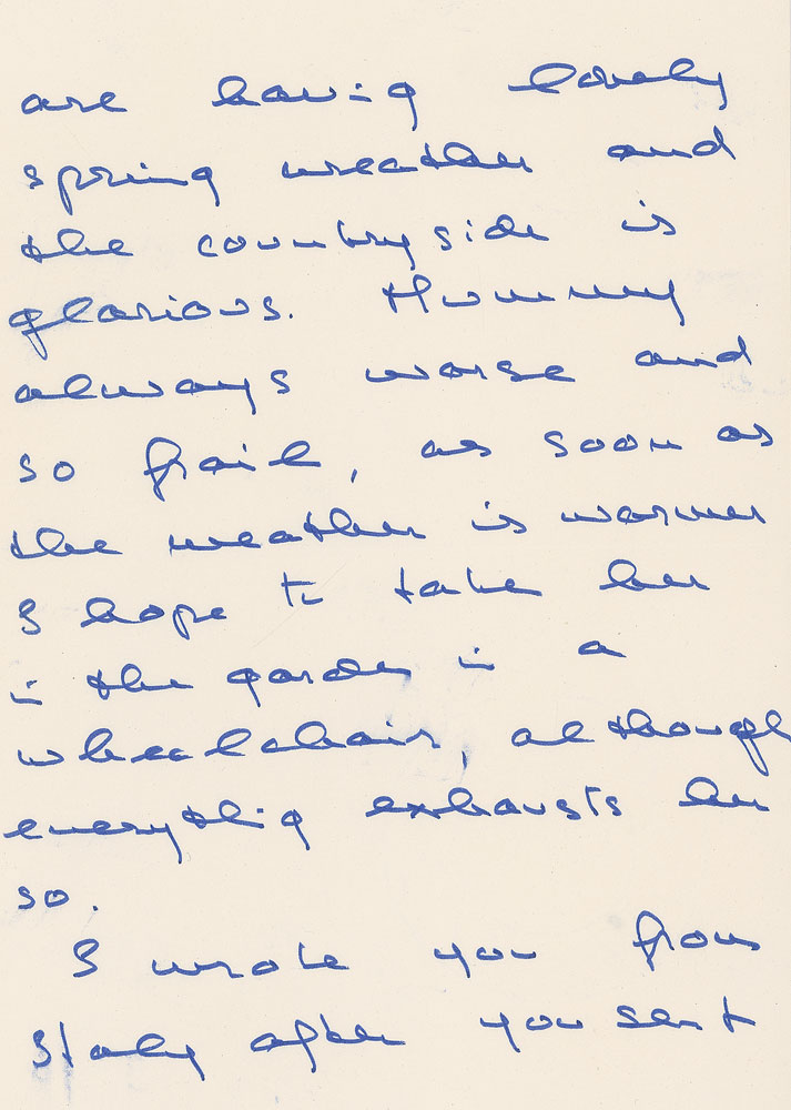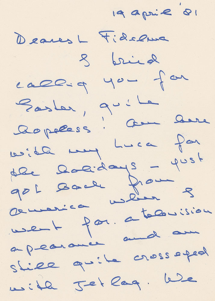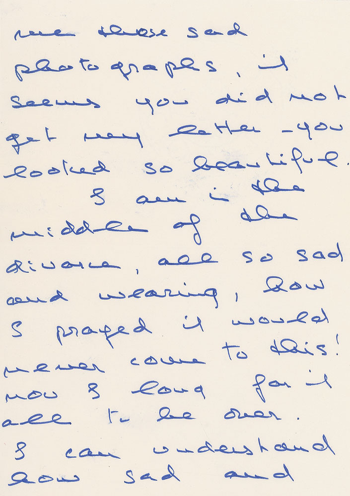 ALS signed “Audrey,” four pages, 5.75 x 8.25, April 19, 1981. Letter to her stepmother, Fidelma Hepburn, in part: “I tried calling you for Easter, quite hopeless! Am here with my Luca for the holidays—just got back from America when I went for a television appearance and am still quite cross-eyed with jet lag. We are having lovely spring weather and the countryside is glorious. Mummy always worse and so frail, as soon as the weather is warmer I hope to take her in the garden in a wheelchair, although everything exhausts her so. I wrote you from states after you sent me those sad photographs, it seems you did not get my letter—you looked so beautiful. I am in the middle of the divorce, all so sad and wearing, how I prayed it would never come to this! Now I long for it all to be over. I can understand how sad and empty you must feel, yet so much love and happiness to look back on.” Accompanied by the original mailing envelope, written in Hepburn’s own hand. In fine condition, with trivial creasing to the right upper and lower corners. This letter finds Hepburn in the middle of her divorce from Italian psychiatrist Andrea Dotti, the actress’s second husband and father of her second child, Luca. Accusations of infidelity—on both sides—proved irreparable, and after thirteen years, the pair separated. Fearful of hurting the emotional welfare of her children, Hepburn postponed the divorce until she felt her children were old enough to properly cope. A crisp and heartfelt correspondence from Hepburn, who, despite her familial burdens, does her best to remain optimistic. Pre-certified PSA/DNA.