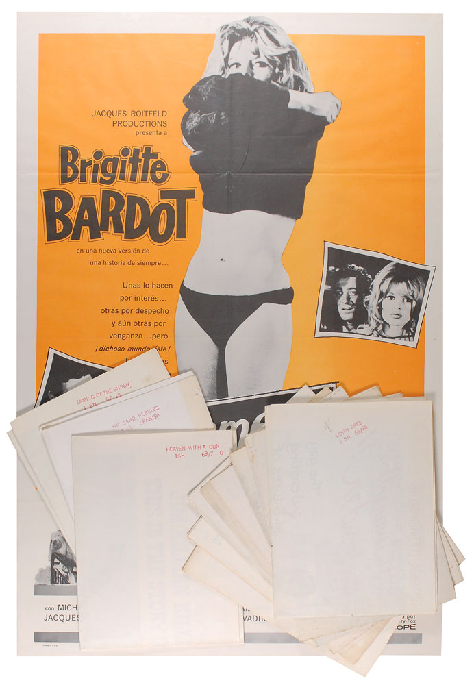 Collection of 47 posters from the 1960s, including 13 one sheets (27 x 41), 10 half sheets (28 x 22), 17 inserts (14 x 36), 6 window cards (14 x 22), and one six sheet (81 x 81). Virtually all genres are covered here, including: horror, sci-fi, suspense, action, romance, comedy, and drama; only four are re-releases (noted by “R”). Highlights are: four Elizabeth Taylor titles, including an impressive The Sandpiper (six sheet); Hang 'Em High (window card); Mary Poppins (insert); Lonely are the Brave (one sheet); scarce Bardot title Please Not Now (one sheet); Wild, Wild Planet (window card); Confessions of an Opium Eater (insert); and two Steve McQueen titles, The Sandpebbles (Spanish, one sheet) and Nevada Smith (half sheet). In overall very good to fine condition, with expected wear to some titles; lot is sold as is.