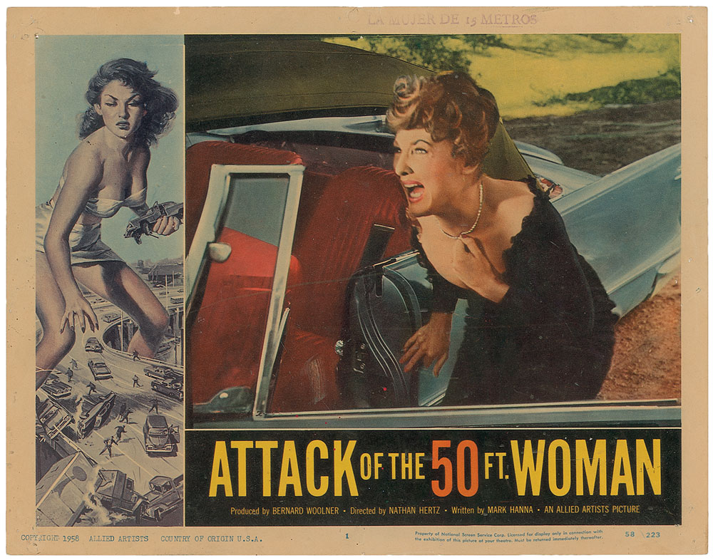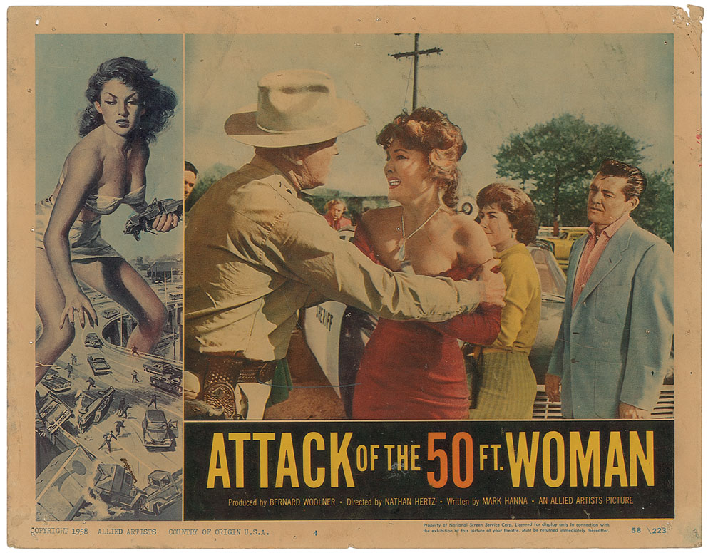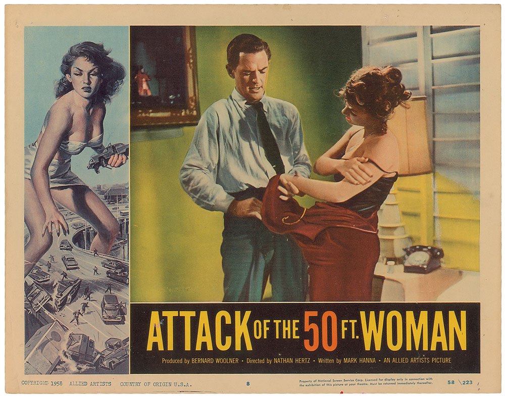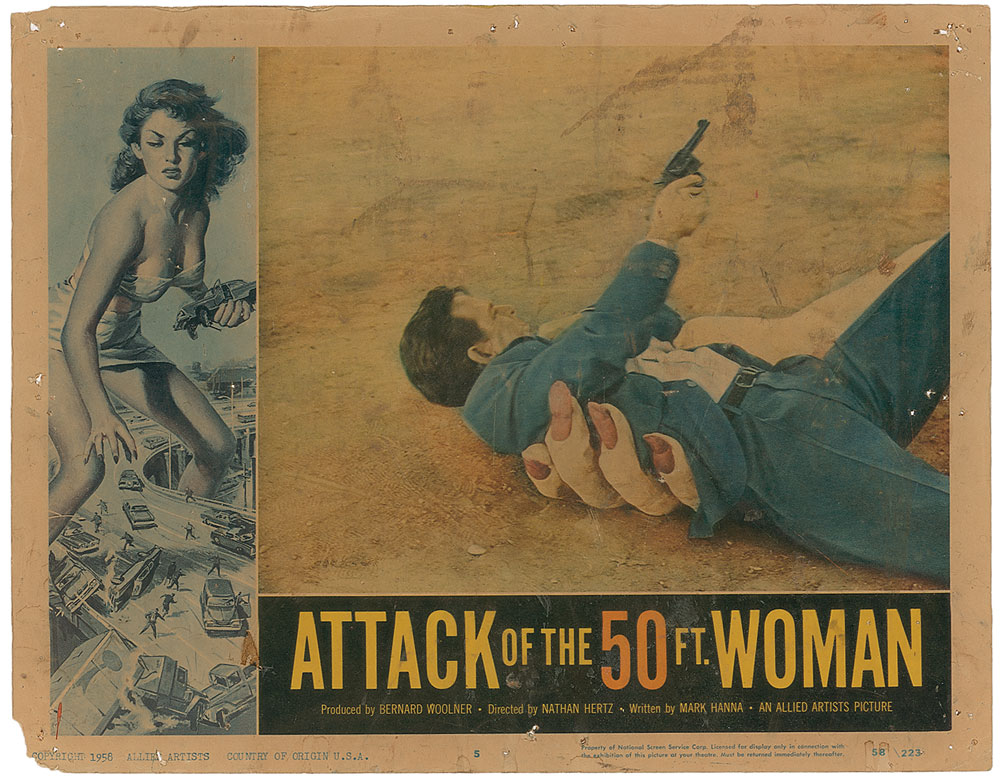 Attack of the 50 Foot Woman (Allied Artists, 1958). Complete set of eight lobby cards (14 x 11). Classic low-budget science fiction movie starring Allison Hayes, William Hudson, and Yvette Vickers in the story of a wealthy socialite whose close encounter with an enormous alien being causes her to grow into a giantess. All bear ink stamps of distributor Cinematografica Pelimex on the reverse. In overall very good condition, with several tack holes to corners, scattered creases and toning, light to moderate soiling, chipped corners to two lobby cards, and an ink stamp to the border of one card. Lobby cards from such 1950s sci-fi cult classics are not often found as a complete set.