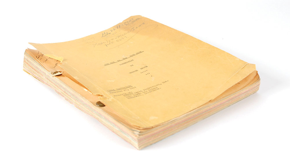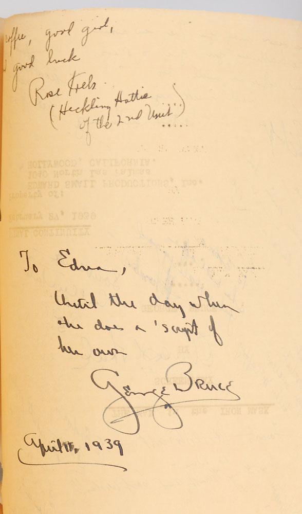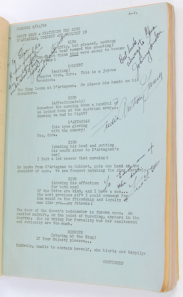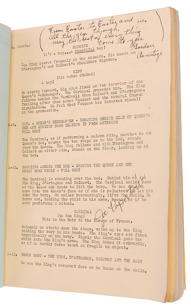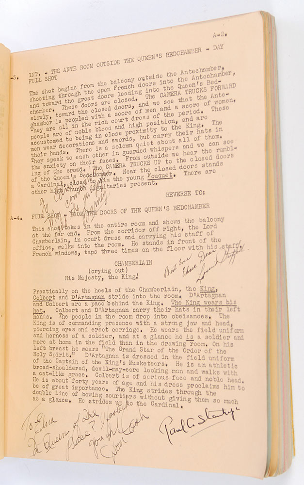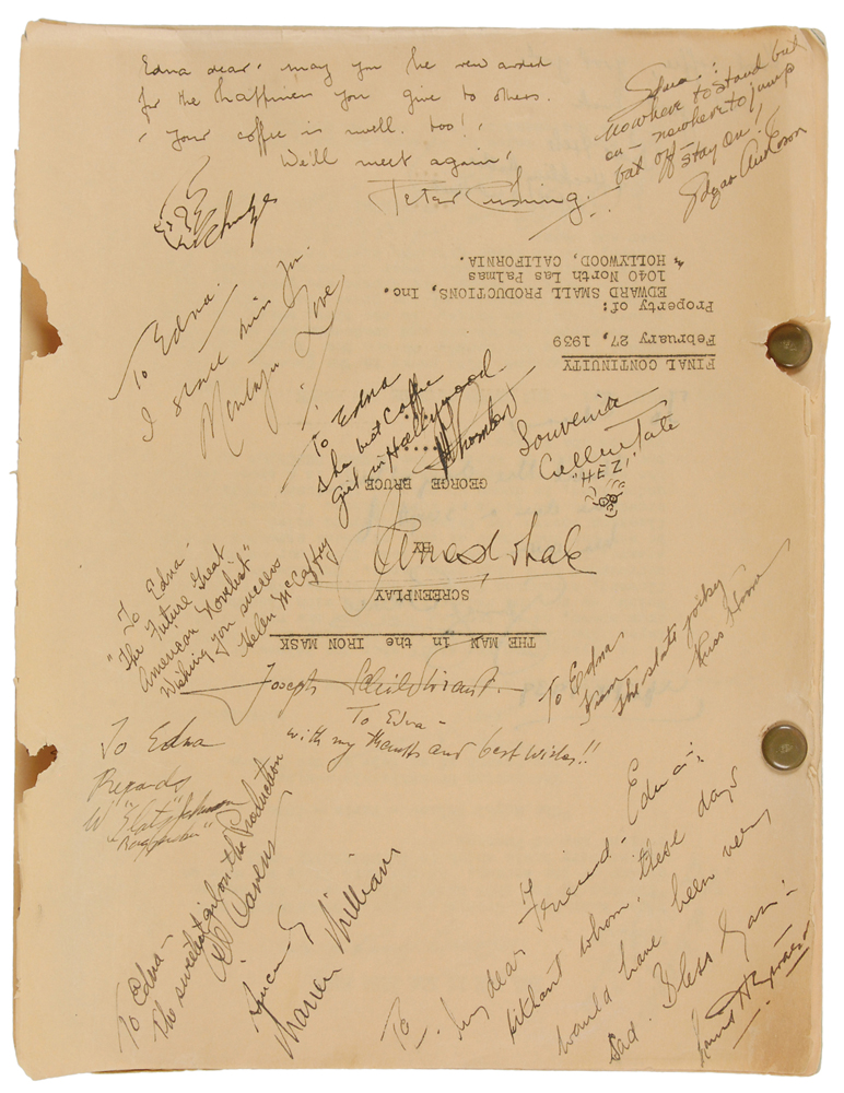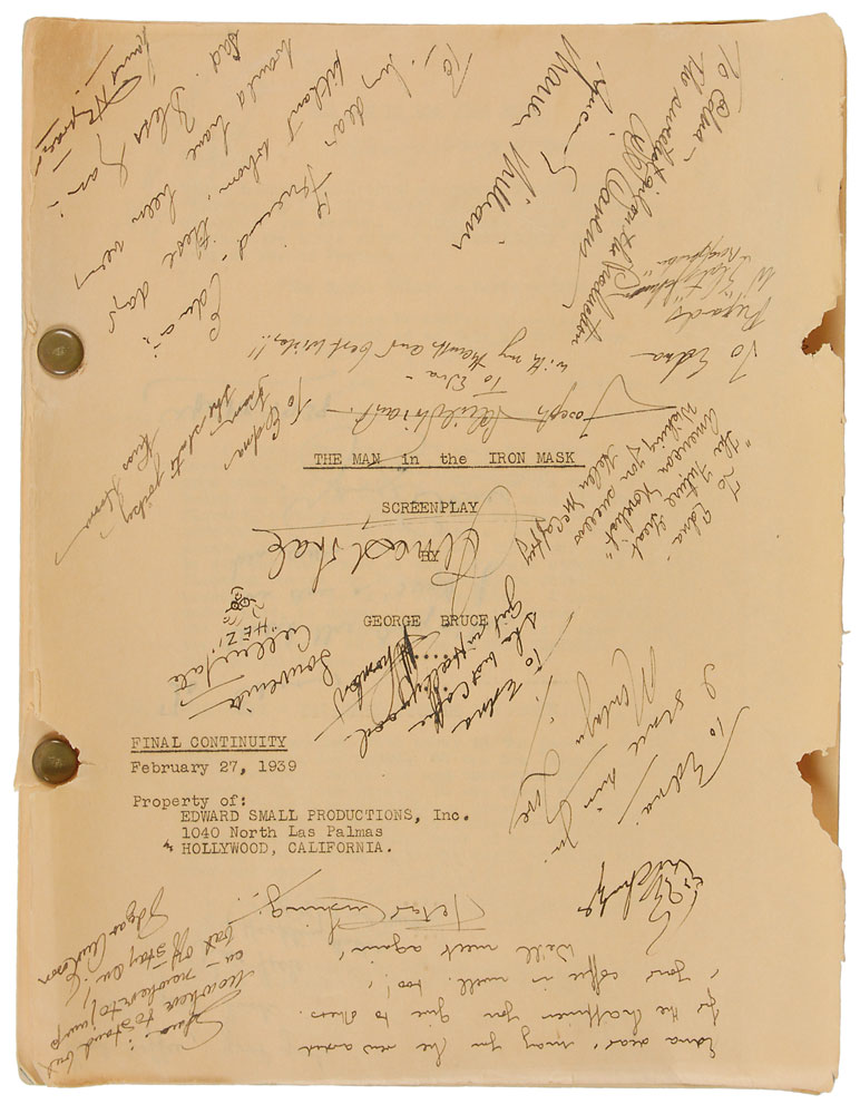 Original brad-bound final continuity screenplay for the 1939 film The Man by in the Iron Mask by George Bruce, 8.5 x 11, February 27, 1939. Signed and inscribed by approximately 50 cast and crew members on various pages throughout the script (with several signing upside down on the title page), including: director James Whale, Peter Cushing, Joseph Schildkraut, I. Stanford Jolley, Louis Hayward, and George Bruce. In very good condition, with significant tears, creases, and toning to loose front cover and title page, with the remainder of the script clean and intact. Directed by James Whale—who previously tackled horror classics like Frankenstein (1931) and The Bride of Frankenstein (1935)—this initial full-sound adaptation of the Alexandre Dumas story is notable for containing Peter Cushing’s motion picture debut. Whale is a notably uncommon and desirable horror autograph. Pre-certified PSA/DNA.