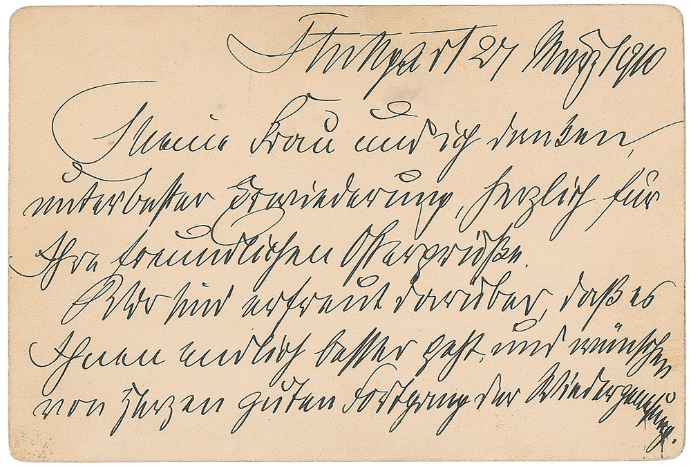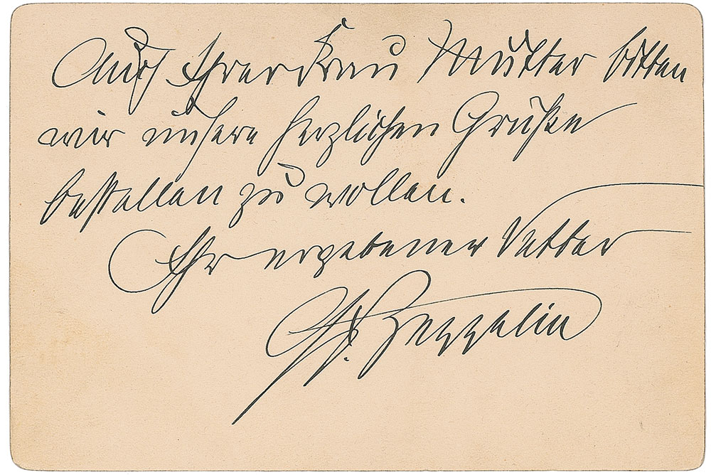 ALS in German, signed “G. F. Zeppelin,” one page both sides, 5 x 3.5, March 27, 1910. Letter to the famous autograph collector Elise Koenig-Warthausen in Stuttgart. In part (translated): "Thanks for your kind Easter greetings. We are pleased that you finally feel better. What's more, we sincerely wish good progress of your convalescence.” In fine condition. Accompanied by the original mailing envelope. Pre-certified PSA/DNA.