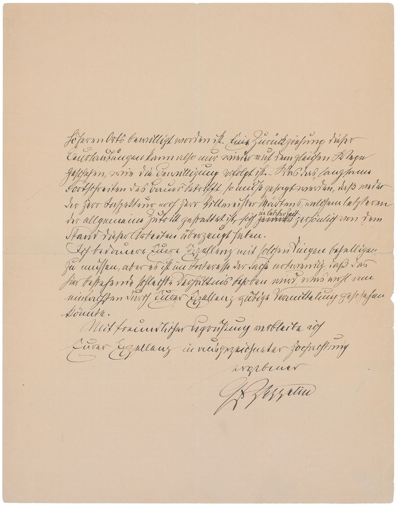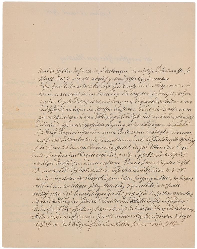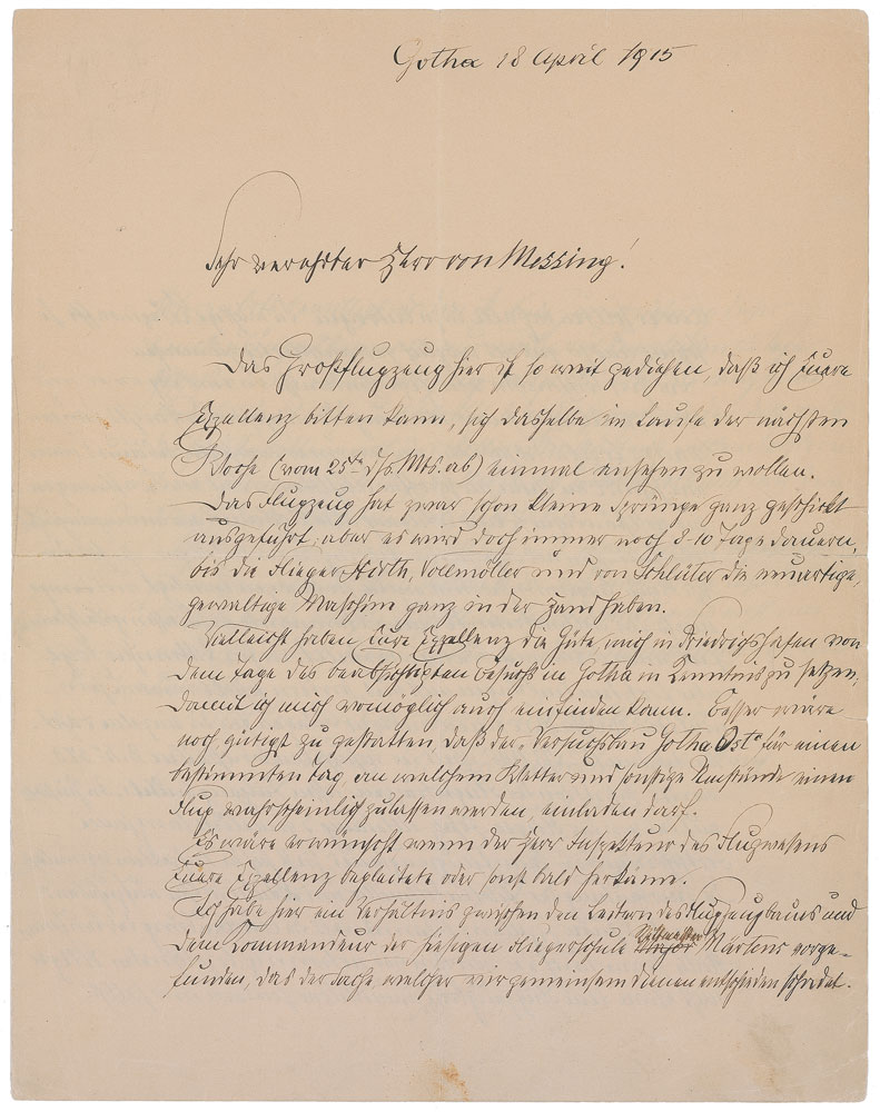 German general and engineer (1838–1917) who designed the famous rigid airship that bears his name. ALS in German, signed “Gf. Zeppelin,” three pages on two adjoining sheets, 8.75 x 11.25, April 18, 1915. Long, interesting letter to Mr. Messing on the difficulties of testing a large airplane in the World War and on some problems with the Gotha squadron. In part (translated): “The large airplane here has progressed so far that I am in a position to ask your Excellency to inspect the same in the course of next week (from the 25th onwards). While the plane has performed several small jumps rather dexterously, it is certainly going to be another eight or ten days before airmen Hirth, Vollmoller and von Schluter have quite mastered this novel and enormous machine...I have here discovered a relationship between the directors of airplane construction and the commander of the flying school, Captain Martens, which proves a decisive detriment to the cause which we all serve together. And we all ought to contribute to completing this important weapon of war as quickly and as well as possible. But the captain raises obstacles wherever he can, convinced that the machine can be no good. He behaves as if he were the construction supervisor and in his written instructions adopts a brusque, commandeering tone...The experimental construction dept. received from the airborne troops inspectorate a letter B No. 373, dated the 15th of this month, beginning: ‘With a view to the slow progress achieved in building the fighter plane as reported by the aviation replacement dept. 3, the inspectorate is prompted to revoke the leave of absence extended to airmen Vollmoller and Schluter.’ Now your Excellency is well aware that Lt. Hirth's leave of absence, as well as that of the airmen he identified as necessary, was not extended by the construction department but to me through higher echelons. The leave can therefore be revoked only through the same channels through which it was extended.—As concerns the slow progress made in construction it must be said that neither the inspector nor Captain Martens (the latter enjoying general access to the site) have lately satisfied themselves personally as to the progress made.” In fine condition, with central vertical and horizontal folds, light soiling, and a few tiny edge tears.