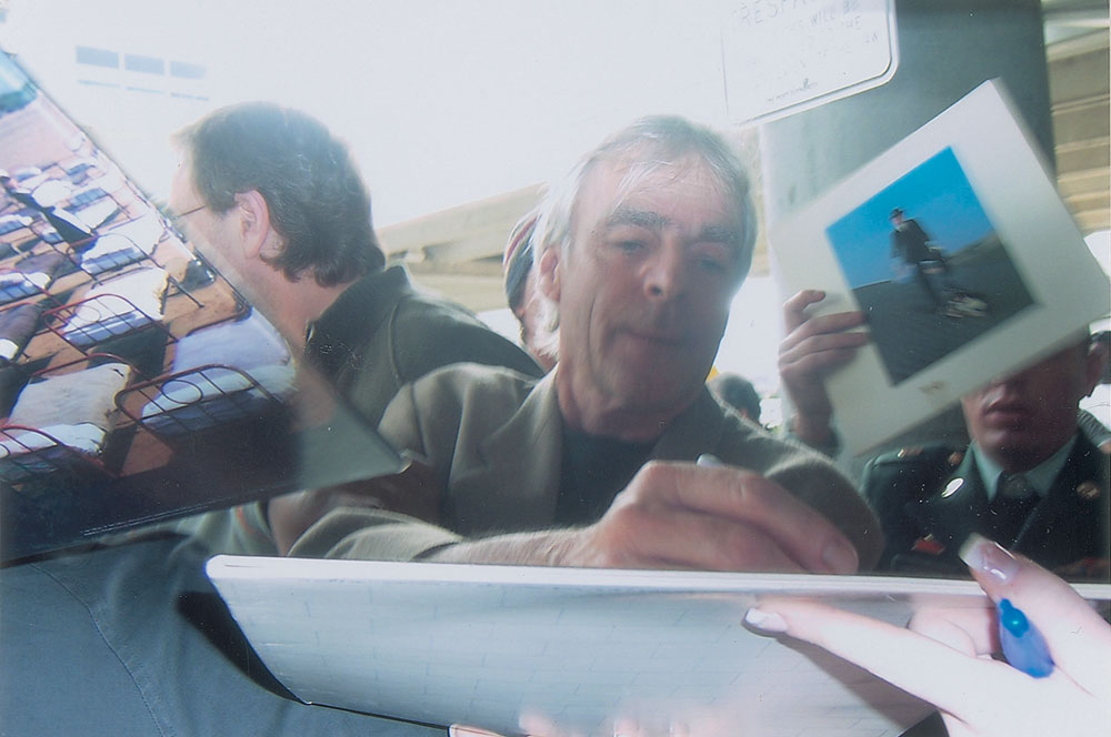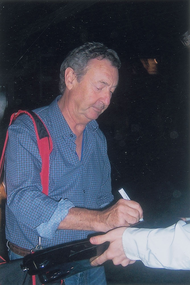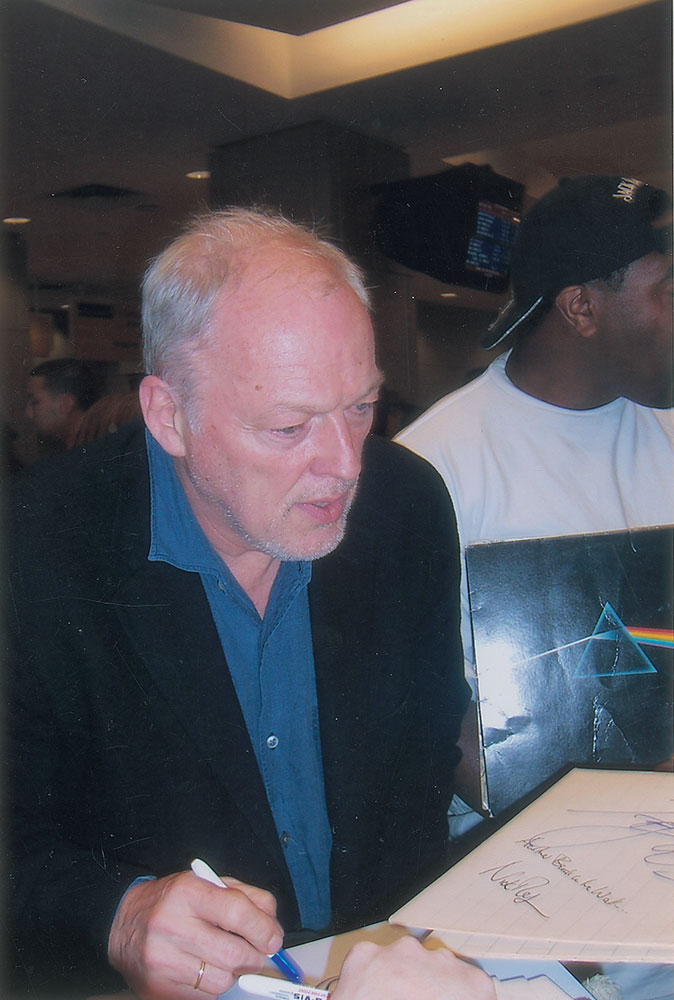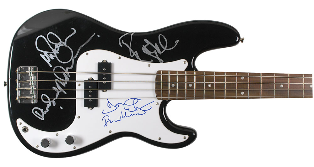 Black-bodied Fender Squier P-Bass electric guitar, signed on the body in silver ink by Nick Mason, adding “Dark Side of the Moon,” and Roger Waters, and on the white pickguard in blue felt tip by David Gilmour and Richard Wright. In fine condition. Accompanied by four photos taken at time of signing. Oversized. Pre-certified REAL.