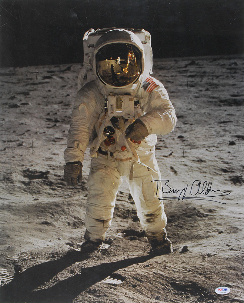 Color glossy 16 x 20 photo of Aldrin on the lunar surface during Apollo 11, signed in black felt tip. A significant bend and crease to the upper right and a PSA/DNA label affixed to the lower corner, otherwise fine condition. Accompanied by a certificate of authenticity from PSA/DNA. Pre-certified Steve Zarelli.