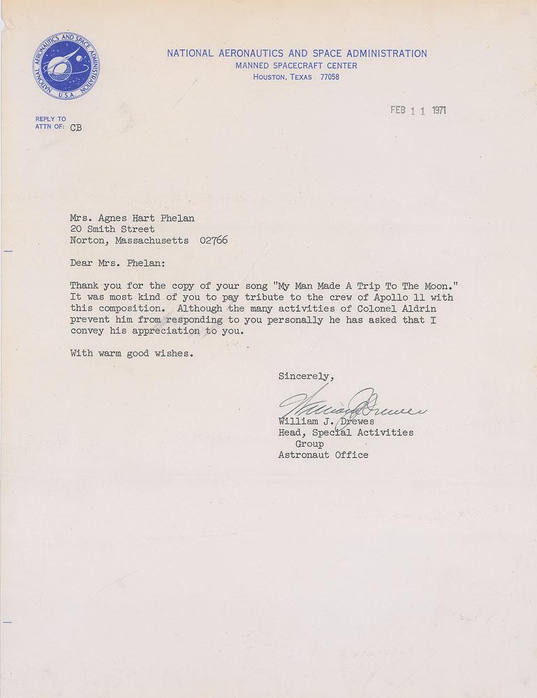 Official color 8 x 10 NASA lithograph of Collins in his white space suit, signed in black felt tip, “Best wishes, Michael Collins.” Light scattered creases, a few edge dings, and small areas of mounting remnants to reverse, otherwise fine condition. Accompanied by the original transmittal letter from the NASA office in Houston, dated February 1971, in part: “Thank you for the copy of your song ‘My Man Made A Trip To The Moon.’ It was most kind of you to pay tribute to the crew of Apollo 11 with this composition.” Pre-certified Steve Zarelli.