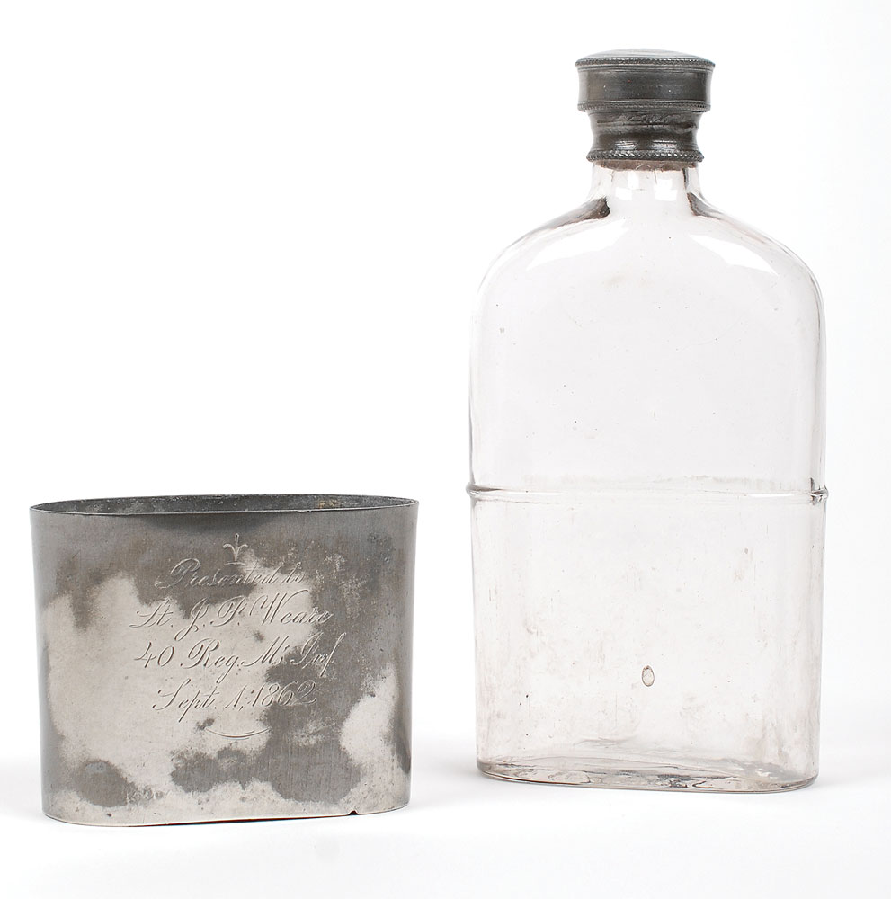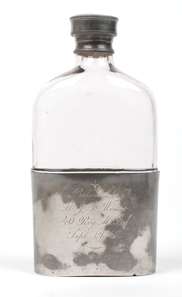 A Civil War whiskey flask engraved on the front of the silver base, “Presented to Lt. J. F. Weare, 40 Reg. Ms. Inf., Sept. 1, 1862.” The pint-sized glass flask stands 7″ tall and has an oxidized silver screw cap and is seated in a removable 2.75″ tall silver sleeve that fits over the lower half. The front of the cup has been partially cleaned to bright metal and the glass flask is in fine condition with the glass bottom maker-marked “E. Wallis Jr., Philada.” John Fairfield Weare was 33 years old when he was commissioned as a 2nd lieutenant on September 1, 1862, into Co. C of the 40th Mass. Infantry. On September 7, 1864, he was promoted to captain, before being discharged on September 21, 1864, for wounds suffered at Cold Harbor, Virginia, on June 1, 1864.