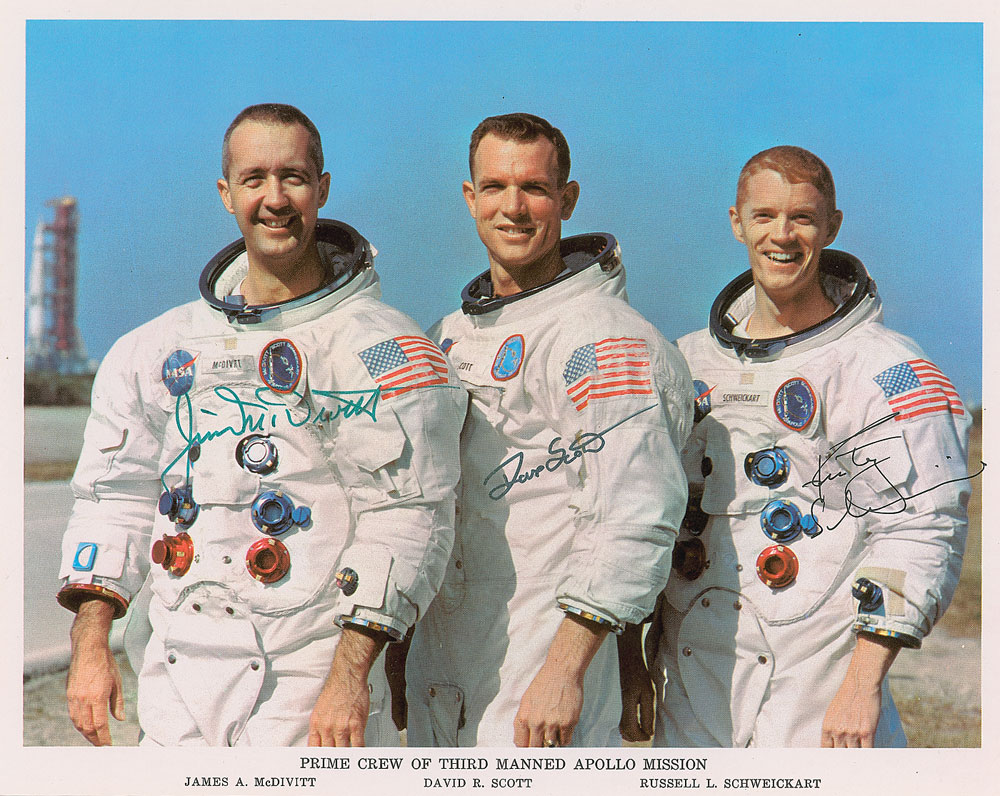 Color official NASA 10 x 8 lithograph of the Apollo 9 crew posing in their white space suits, signed in felt tip by Jim McDivitt and Dave Scott, and in black ink by Rusty Schweickart. In fine condition. Pre-certified Steve Zarelli.