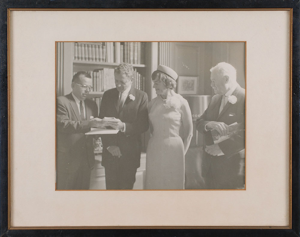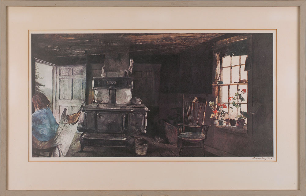 Exceptional color 24.25 x 12.5 print entitled ‘Wood Stove,’ signed in the lower border in fountain pen by Wyeth. Nicely matted and framed in its period frame to an overall size of 31 x 20. In fine condition. The print was originally given as a gift to Maine legislator John Knight on the day he gave Wyeth an award from the state, and is accompanied by a letter of provenance and framed photograph of the ceremony. A beautiful signed print with an interesting history. Oversized. Pre-certified John Reznikoff/PSA/DNA.