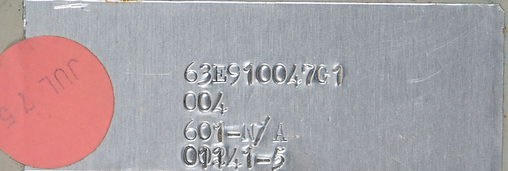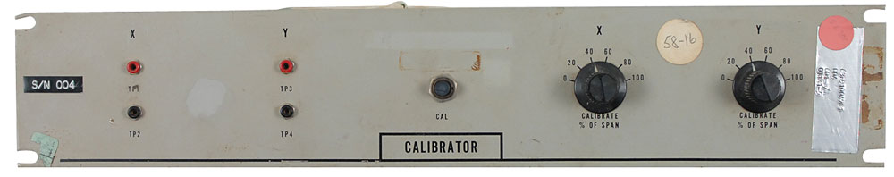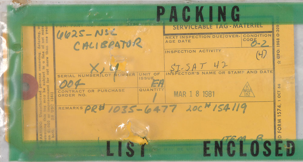 Two different pieces of space program hardware: a temperature transducer intended for the Saturn V Second Stages (S-II), measuring 1 x 1.75 with 11.75″ long leads, with labels noting a serial number of “07724Rdf0335” and part number of “4051,” along with paperwork dated 1967 filled out with various test calibration results; and a rack-mountable calibrator, circa 1970s-80s, 19 x 3.5 x 5, with four inputs and two knobs on the front. Service tag affixed to the top identifies the device as a “6625-NSL Calibrator.” This device was used to calibrate test equipment. In overall very good condition, with toned tape remnants and some cracks to the plastic case of the transducer. Oversized.