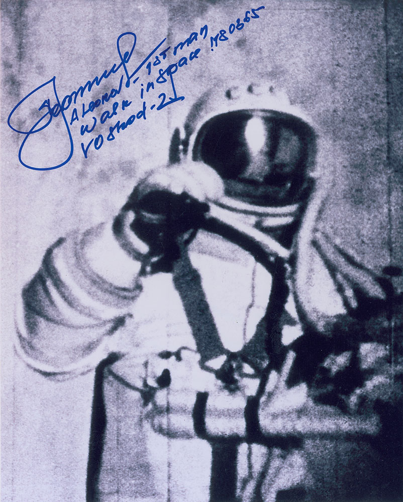 Satin-finish 8 x 10 photo of Leonov in his space suit, signed in blue felt tip, “A Leonov—1st man walk in space! 18 03 65, Voskod–2.” In fine condition. Pre-certified Zarelli Space Authentication.
